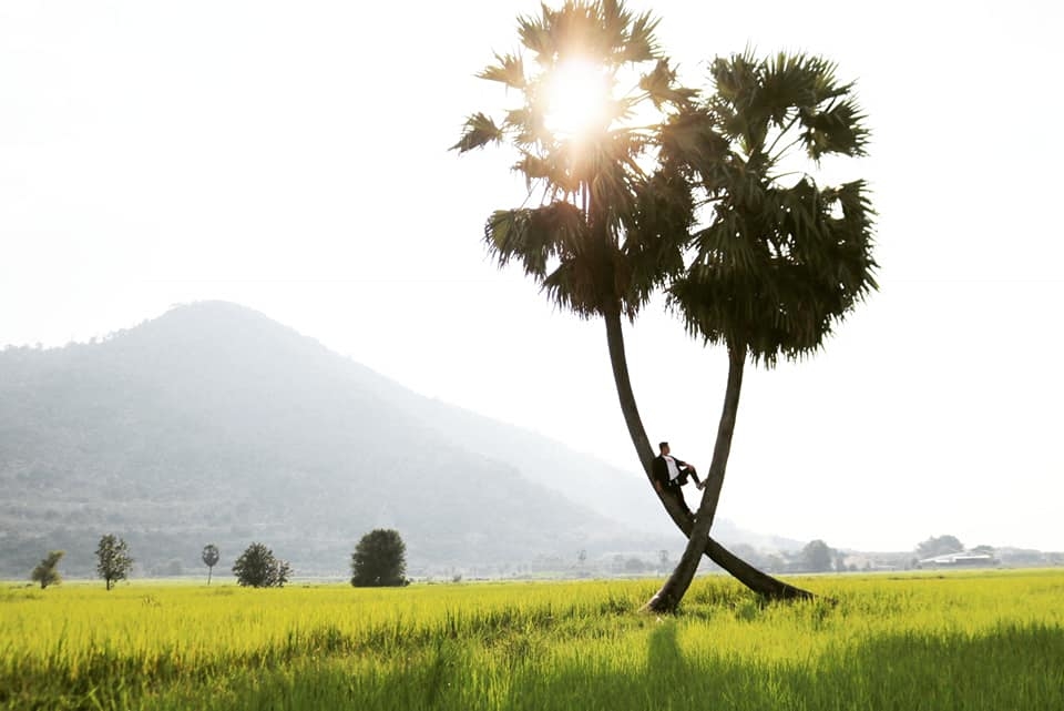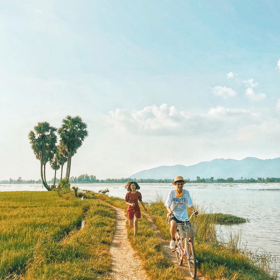 Ở Tây Ninh có 2 cây thốt nốt đan vào nhau ngay giữa cánh đồng lúa mênh mông, bạt ngàn. Ngoài sống ảo với đồng lúa, các bạn có thể lựa góc mà chụp hình với cây thốt nốt này trong cái nắng chiều vàng ươm xen lẫn qua từng tán cây kẽ lá.