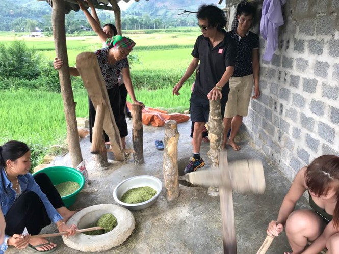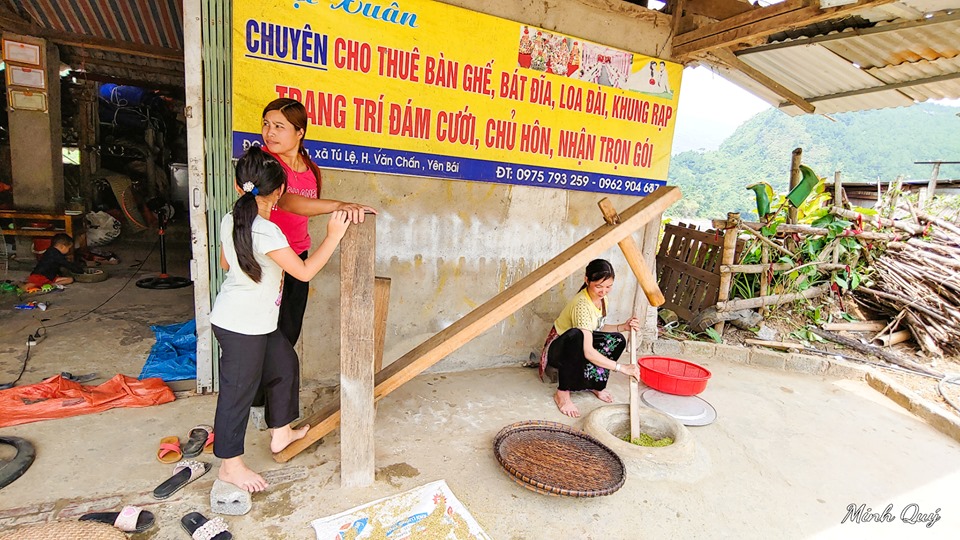 Trong tiết trời mát mẻ của những ngày chuyển mùa từ hạ sang thu, từng đoàn du lịch đến với cung đường Tú Lệ - Mù Cang Chải đều dừng chân tại chân đèo Khau Phạ, nơi bản Nà Lóng rộn rã tiếng chày giã cốm của đồng bào Thái.