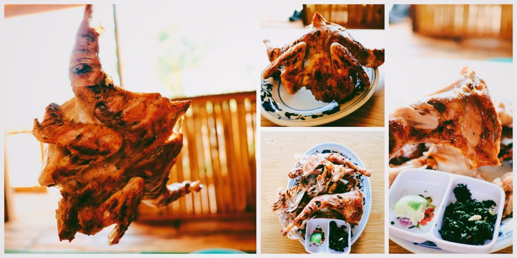 Một món cơm mà nhất định bạn không được bỏ qua khi tới đây đó là ” cơm lam và gà nướng”. Những ống cơm được nấu bằng loại gạo nếp nương hạt nhỏ, thuôn dài, khi nấu với ống tre, nứa nên mang hương vị của núi rừng. Mùi thơm của gạo quyện với mùi ngai ngái của tre nứa rất khó tả nhưng rất đặc trưng. Những con gà được thả, thịt dai, chắc được ướp cùng với chút muối cho đậm đà, ớt, sả và một chút mật ong rồi kẹp vào thanh tre nướng trên bếp lửa hồng đến khi thành một màu vàng ruộm, mỡ màng.