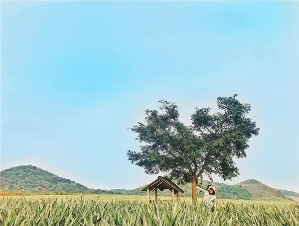 Màu xanh đậm nhạt của dứa ở đây phụ thuộc vào thời gian sinh trưởng, dứa non hay già, đang ra đọt hay đậu quả. Do đó đến vào nhiều thời điểm khác nhau bạn lại có những tấm ảnh mang nhiều sắc màu khác nhau, tuy nhiên thời điểm đẹp nhất của nông trại dứa có lẽ rơi vào tầm tháng 3 đến tháng 7, khi ánh nắng rực rỡ chiếu rọi xuống, bạn sẽ thấy cả vườn dứa vàng ươm lấp lánh.