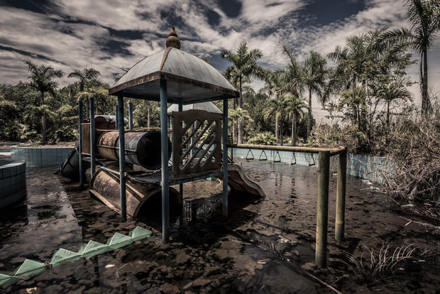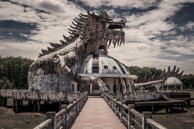 Xung quanh công viên phủ kín cây cối, cỏ dại khiến không gian trở nên hoang vu. Đặc biệt nhất là những ngày mưa bụi trời u tối thì nơi đây khiến cho người ta thấy rợn tóc gáy. Nhất là khi bạn bước vào tòa nhà hình rồng, đâu đâu cũng là mảnh vỡ, đổ nát, rêu phong, thật sự dễ khiến ta "hết hồn". Fan của ngày lễ Halloween, có dịp đến Huế đừng quên chụp concept rùng rợn tại công viên nước hồ Thủy Tiên nhé.