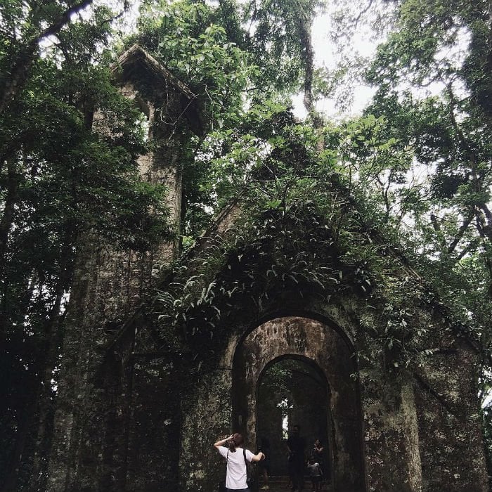Trong vườn quốc gia Ba Vì còn để lại khá nhiều tàn tích của kiến trúc Pháp như biệt thự, dinh đại tá, nhà thờ, cô nhi viện...chỉ còn lại khung với những mảng tường phủ đầy rêu xanh và rễ cây bám chằng chịt mọi nơi. Nhà thờ cổ trong khuôn viên vườn quốc gia Ba Vì không chỉ là địa điểm chụp ưa thích của các concept chụp hình cô dâu mà còn là địa điểm săn ảnh Halloween cho nhiều bạn trẻ.