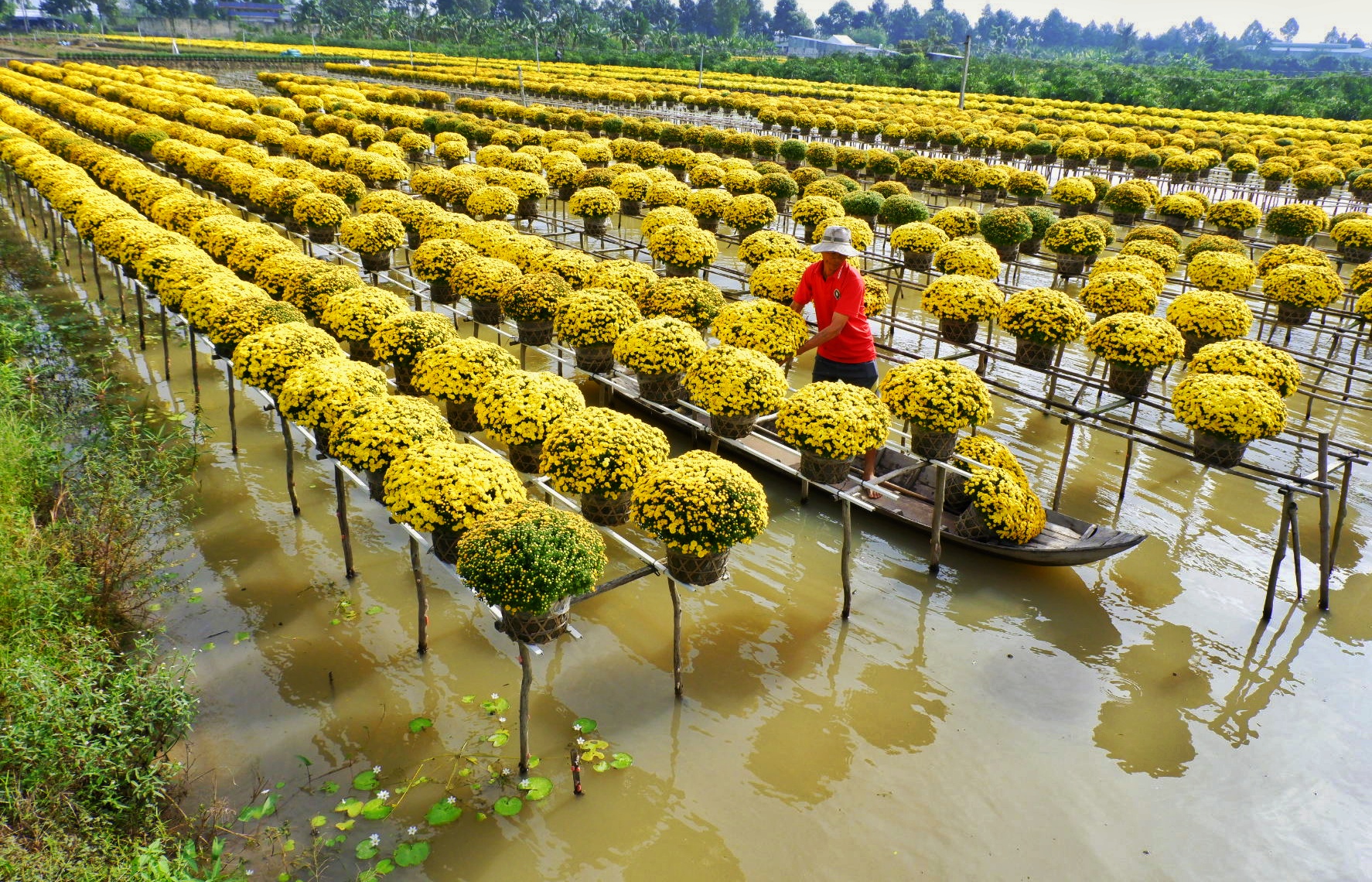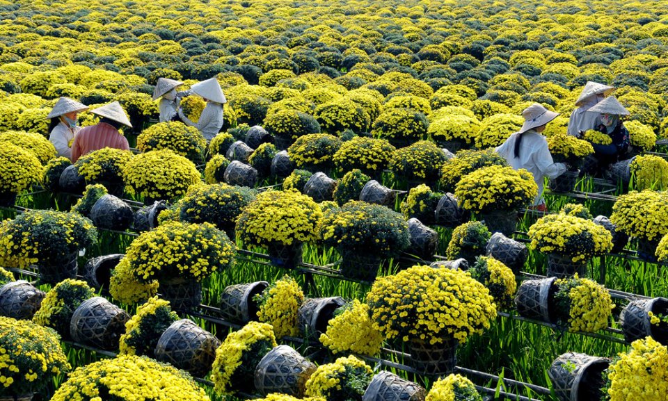 Về Sa Đéc trong những ngày cuối tháng Chạp, không khí rộn rã, nhộn nhịp len vào từng ngõ ngách. Đây cũng là thời điểm hoa tết tại làng hoa trăm tuổi này được xuất đi nhiều nơi. Trong đó, những cánh đồng cúc mâm xôi bát ngát luôn dễ dàng thu hút sự chú ý bởi sắc vàng rực rỡ đặc trưng cũng như kiểu dáng bo tròn độc đáo của loài hoa này.