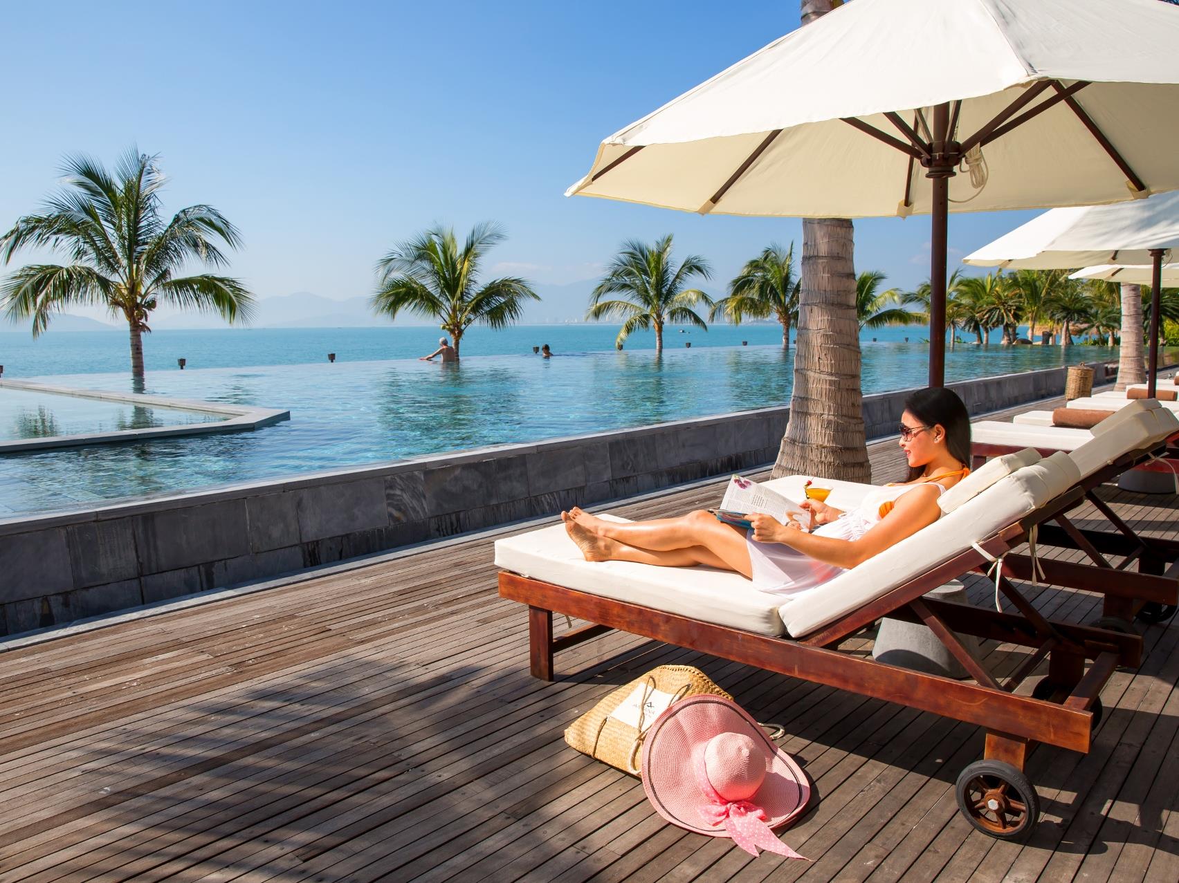 Tại Amiana Resort & Villa Nha Trang còn sở hữu hồ bơi nước mặn tự nhiên tuyệt đẹp rộng 2.500 m2, một hồ bơi vô cực rộng 700 m2 và một bãi biển kín đáo riêng tư chỉ dành cho khách đến lưu trú với bờ cát trắng mềm mại và làn nước trong vắt thấu đấy.