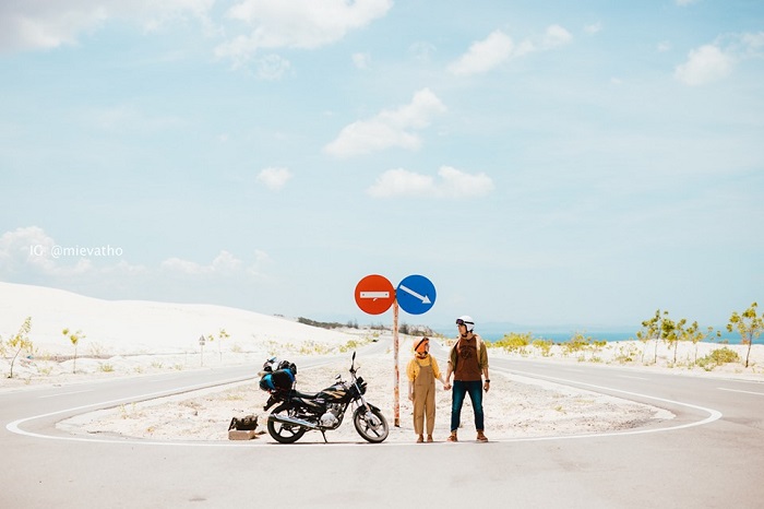 Không phải là những khúc cua uốn lượn lưng chừng đồi hay khung cảnh núi rừng hoang sơ mà cung đường từ Phan Rí Cửa đến Mũi Né gây ấn tượng bất cứ gã lái xe nào bằng những cồn cát trắng dài đến cuối đường chân trời. Màu trắng của nền cát trắng, màu xanh của nền trời và biển khiến con người trở nên nhỏ bé trước thiên nhiên. Lạc lõng trên con đường quanh co, uốn lượn theo triền cát, càng đi khung cảnh lại càng mở rộng thêm bất tận. Bạn cũng có thể vô tình bắt gặp một quán cafe di động rực rỡ giữa đất trời bao la ở nơi này. Một điểm nghỉ chân cần thiết lại lên hình cực đẹp.