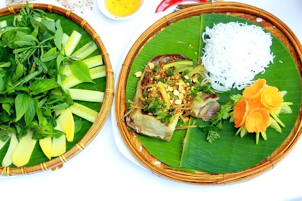 Lấy một miếng bánh tráng mỏng, cho các loại rau như xà lách, húng quế, tía tô, chuối chát, dưa leo… ít bún tươi, thịt cá, cuốn tròn lại và thưởng thức với nước chấm đậm đà hơi chua chua. Thịt cá béo ngọt hòa trong hương vị thanh mát của các loại rau rất ngon miệng và không gây cảm giác ngấy.