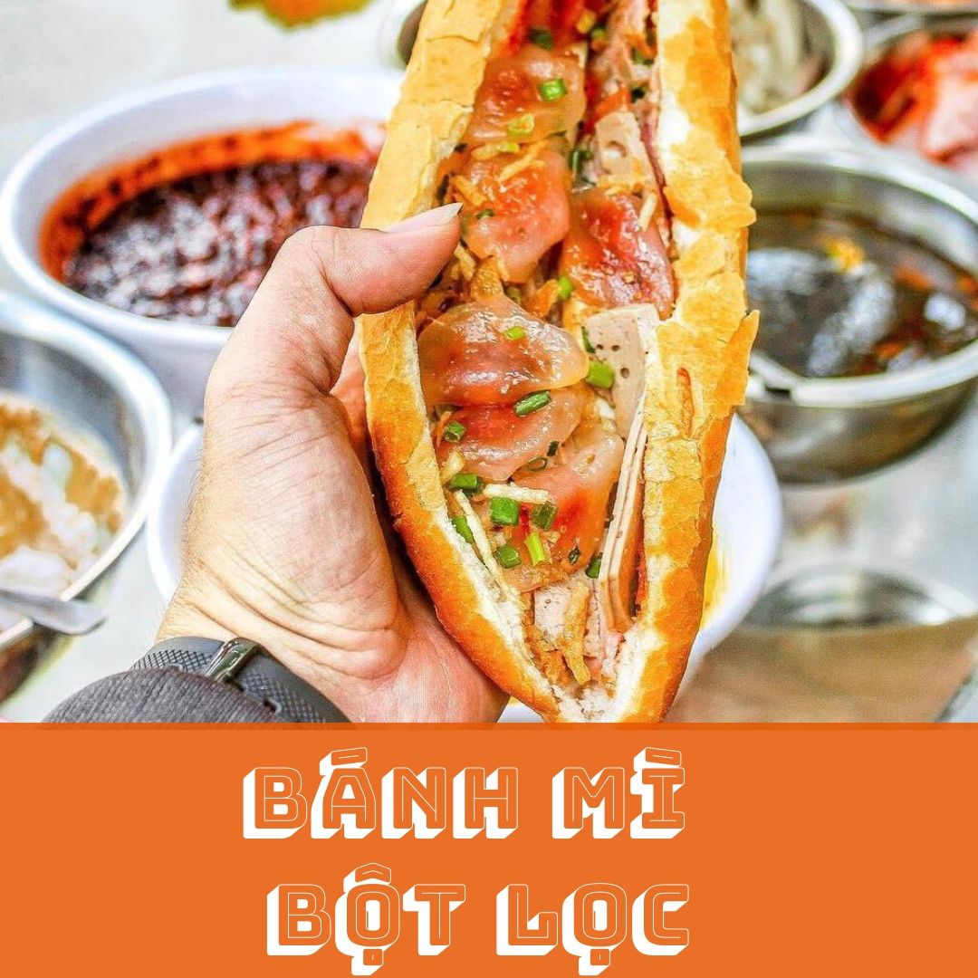 Không phải lớp nhân pate ngậy thơm, không phải xúc xích, xíu mại mà món bánh mì có lớp nhân dai dai này chính là bánh bột lọc. Bánh bột lọc được trần sơ cho mềm, ăn cùng xoài nạo, thêm miếng chả thịt và dưa chuột, rau mùi cùng chút mắm ớt cay - gia vị không thể thiếu trong ẩm thực xứ Huế. Ăn bánh mì bột lọc bạn sẽ vừa cảm nhận được vị dai dai của bánh bột lọc lại vừa thấy được sự giòn rụm của vỏ bánh bên ngoài.