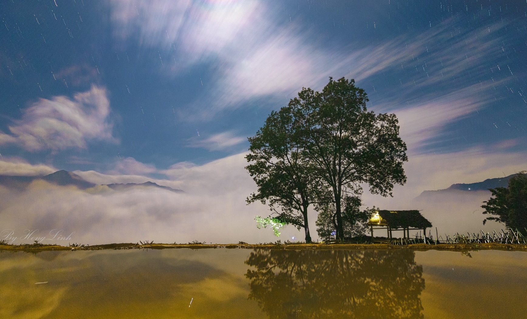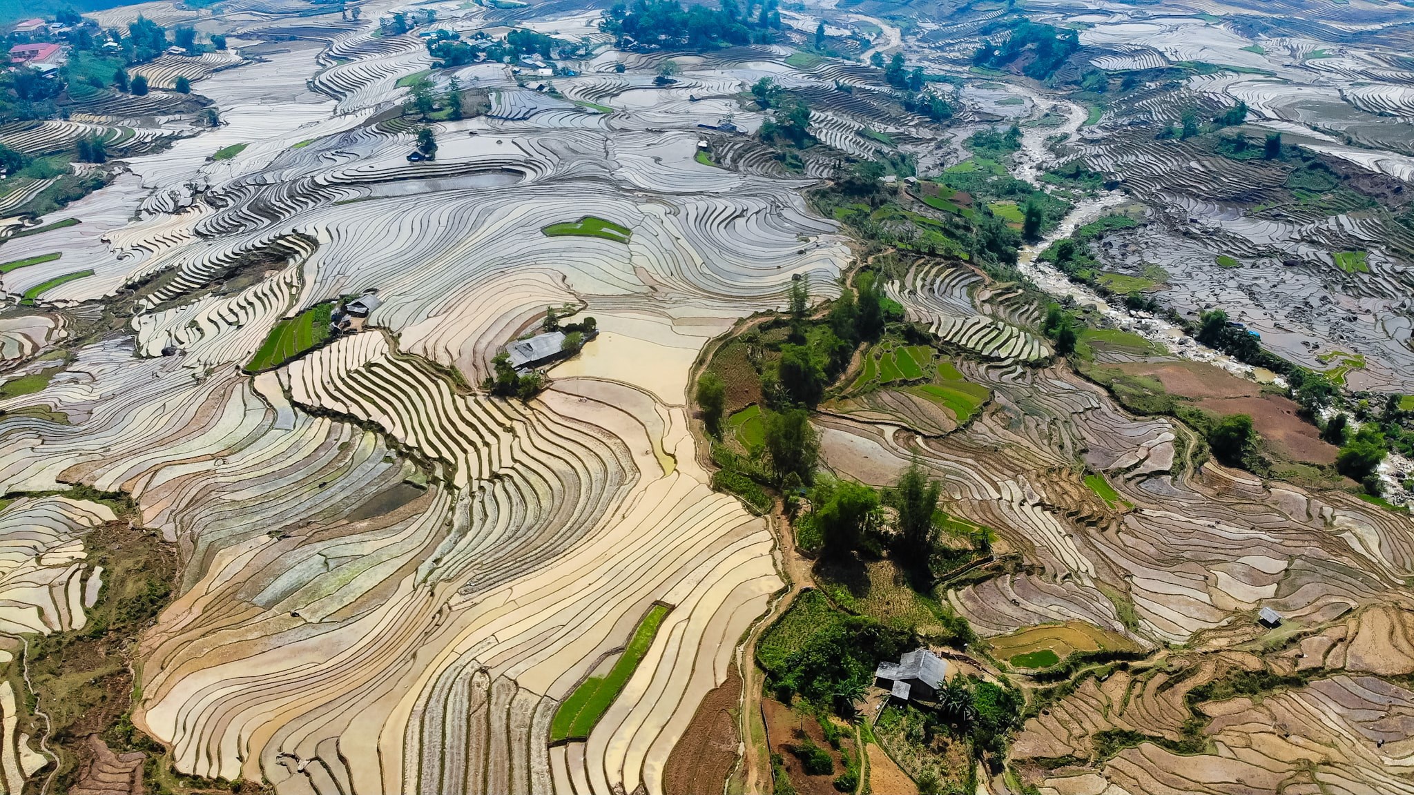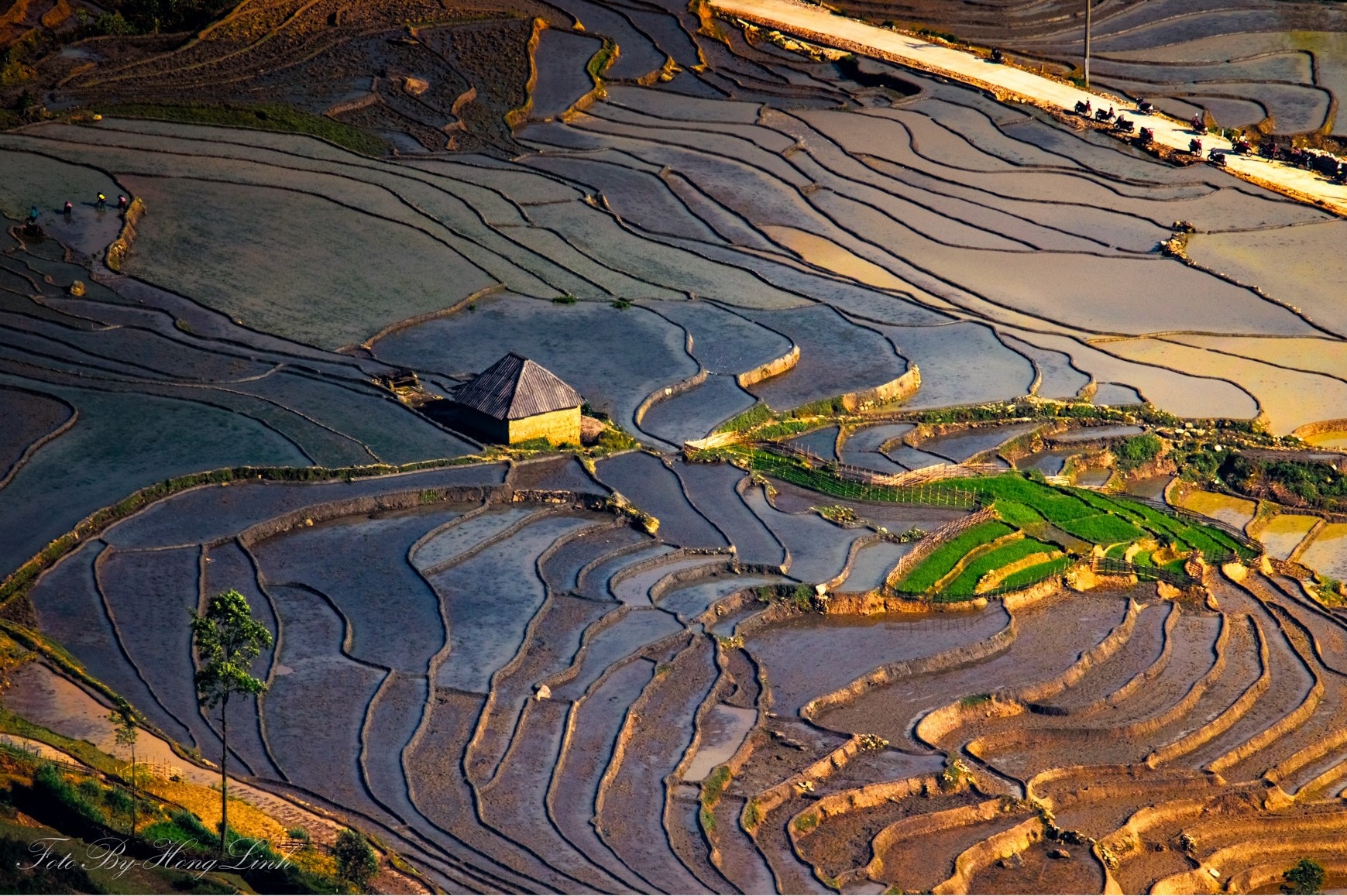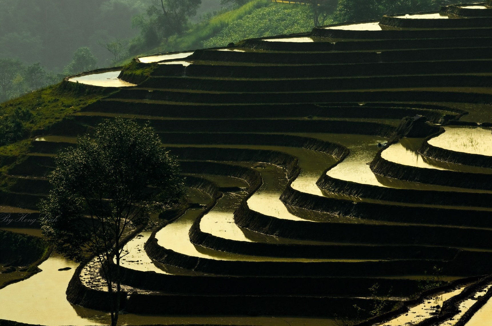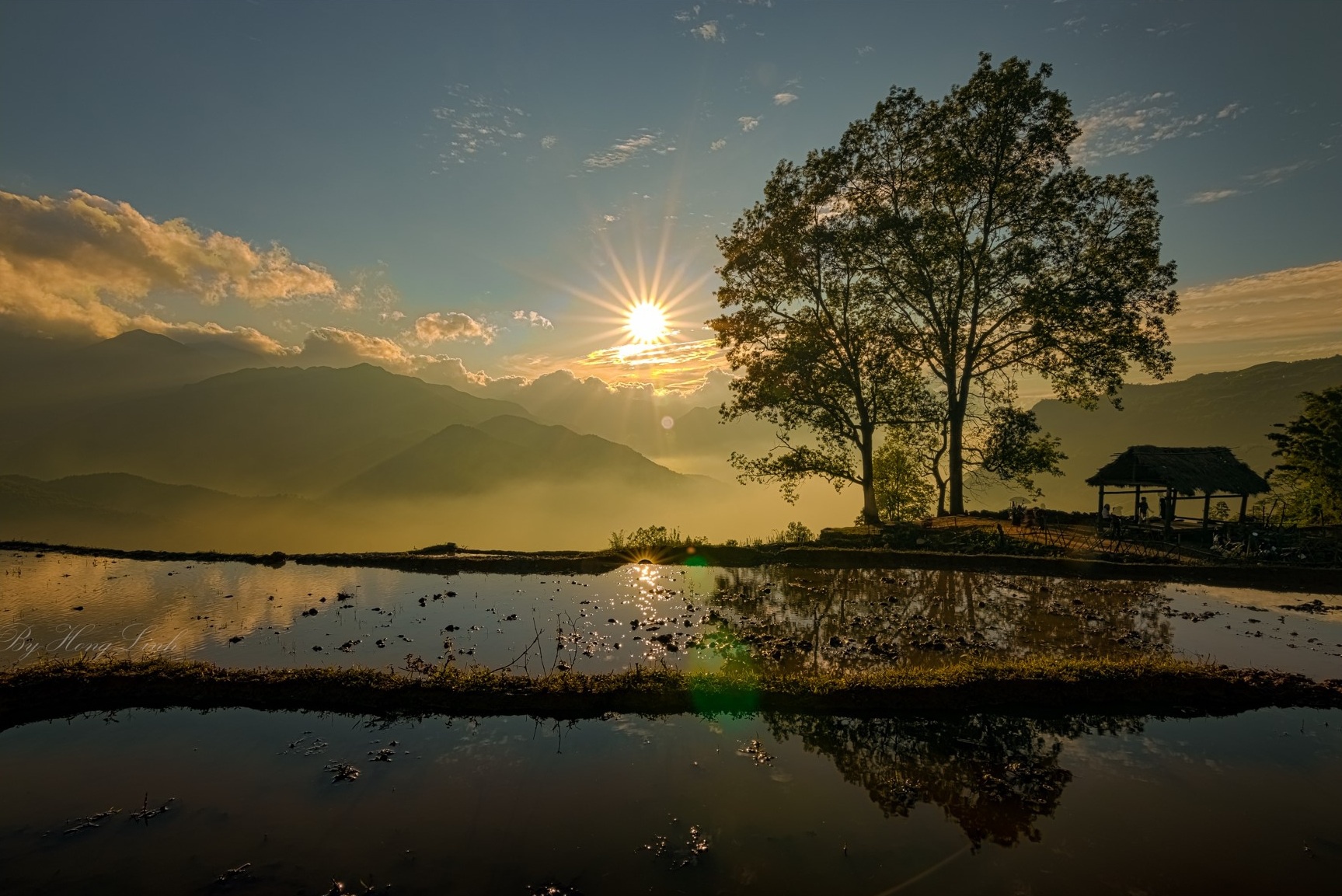 Giữa những gam màu sáng tối đan xen, ánh nắng chiếu rọi của mặt trời như dát thêm lớp bạc óng ánh lên từng lớp nước, làm cho cảnh sắc thêm phần kỳ ảo. Bức tranh ruộng bậc thang mùa nước đổ còn chấm phá với những ngôi nhà trình tường nhỏ của người Hà Nhì vừa hòa hợp vừa toát lên nét mộc mạc, yên bình.