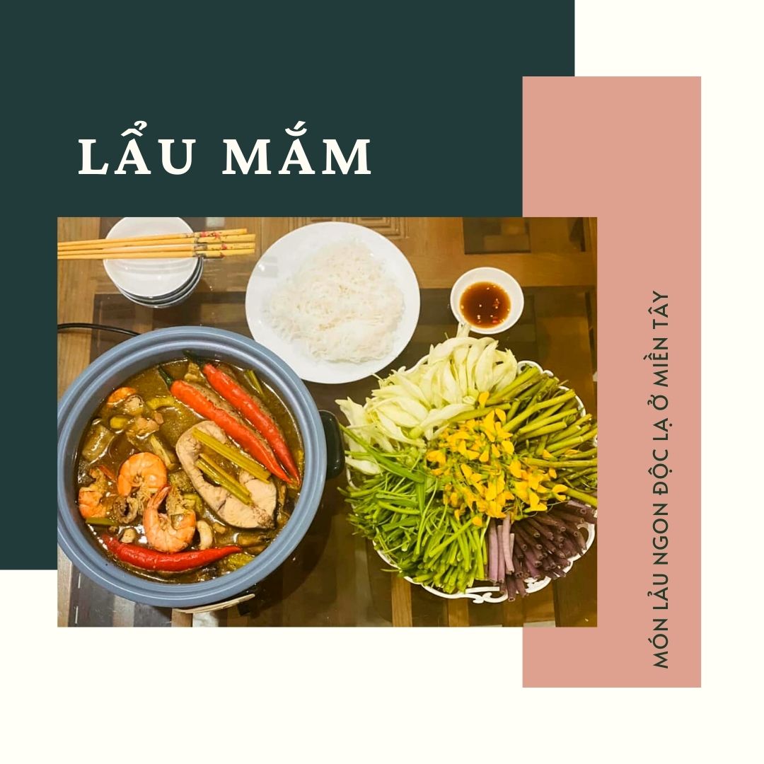 Lẩu mắm - đặc sản của vùng sông nước Cửu Long. Đến những vùng Cần Thơ hay Châu Đốc du khách đều có thể dễ dàng tìm thấy một nhà hàng hay quán ăn phục vụ lẩu mắm. Lẩu mắm kích thích vị thác của người ăn bởi hương thơm đậm, thịt thà phong phú với nhiều loại rau đặc trưng của vùng sông nước Cửu Long như điên điển, cọng bông súng, rau đắng, hoa so đũa, thèo nèo...