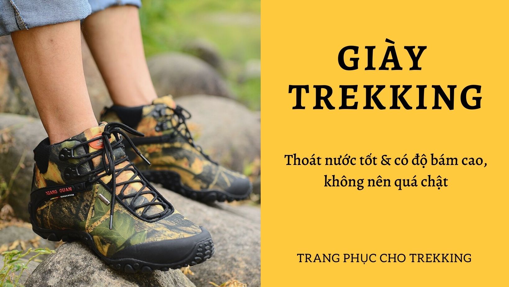 Vì trekking là hình thức du lịch khám phá (thêm chút mạo hiểm) nên việc lựa chọn một đôi giày cho việc di chuyển, đi lại sao cho thuận tiện là cực kỳ quan trọng cho chuyến hành trình của bạn. Bạn cần lựa chọn đôi giày có tính chống nước, hoặc thoát nước tốt, cổ cao hoặc cổ thấm với mức bám tốt. Du khách nên chọn giày trekking có độ bám tốt và không quá chật, dễ gây ma sát làm chân phồng rộp.