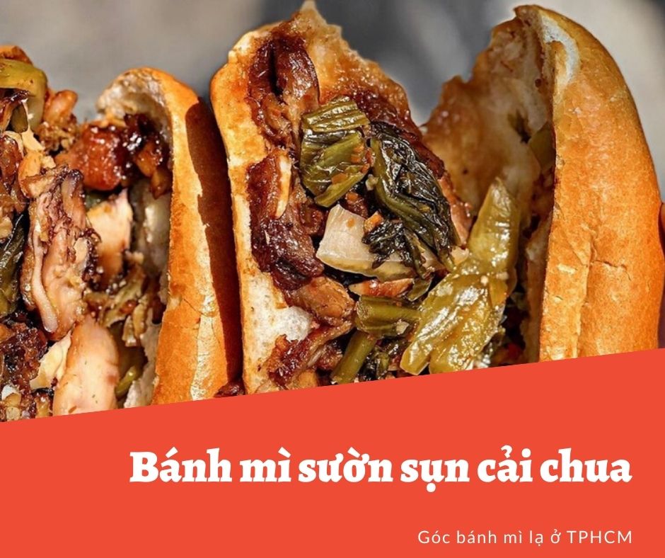 Bạn đã từng thử bánh mì kẹp sườn sụn cải chua chưa? Sự pha trộn và kết hợp lạ miệng của sườn sụn với cải chua tạo nên hương vị độc nhất vô nhị cho món bánh mì này. Sườn được tẩm ướp, sau khi nướng được xắt nhỏ, thêm cải chua, hành ngò và nước sốt. Vị chua từ rau cải muối làm giảm độ ngấy và gia tăng sự kích thích của sườn. Ở Sài Gòn có quán bánh mì nằm trên đường Nguyễn Thần Hiến với 40 năm bán món bánh mì này.