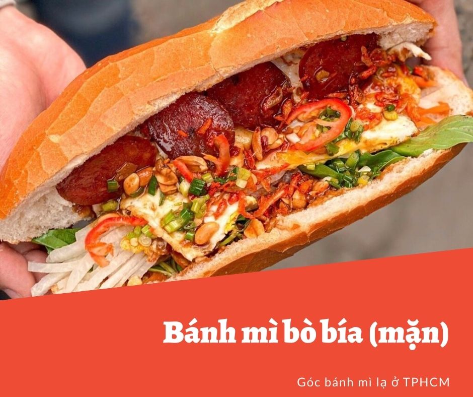 Bò bía mặn là món ăn vặt phổ biến ở miền Nam. Bánh mì nhân bò bía gây ấn tượng bởi nhân bánh phong phú với màu sắc hài hòa, hương vị lạ miệng đến từ các nguyên liệu như củ sắn, lạp xưởng, trứng rán, mỡ hành… Nước sốt tương đen chấm bò bía thơm ngậy đã tạo nên điểm nhấn đặc biệt hơn hẳn so với các loại bánh mì khác. Bạn có thể mua tại đường Cách Mạng Tháng 8 vào buổi chiều để thưởng thức món ăn này.