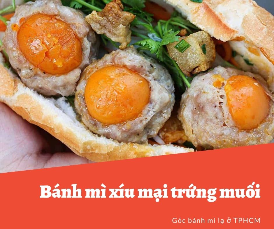 Giống hệt với tên gọi, bánh mì xíu mại trứng muối có lớp nhân xíu mại đậm đà và trứng muối bùi béo. Xíu mại nặn cùng trứng muối được hầm trong nồi nước sốt đỏ cam bắt mắt. Chỉ cần thêm chút rau thơm, đồ chua và mỡ hành thơm ngậy phết trên ruột bánh là đã có ngay món ngon cực hấp dẫn.