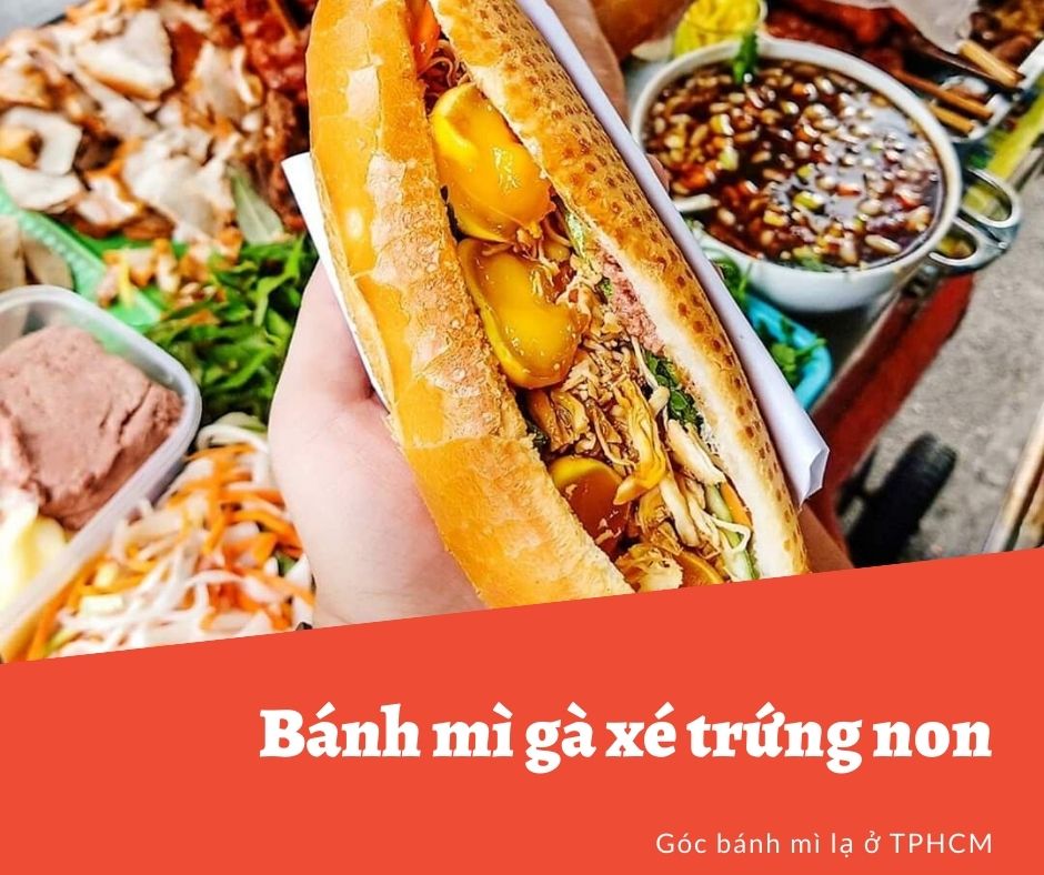 Bánh mì có độ ngậy béo của trứng lòng đào được phết cùng pate, gà xé đậm đà tạo nên hương vị độc đáo của món ăn. Du khách có thể tìm thấy ở các quán như bánh mì 61, tiệm Bread Brothers...Bạn có thể thay thế trứng lòng đào bằng trứng gà non tùy theo sở thích của mình.