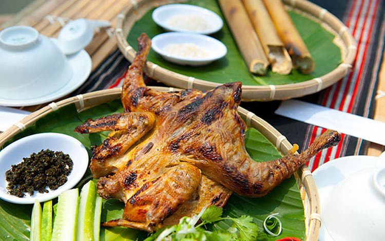 Người dân địa phương ở đây chỉ thực sự đãi món ăn này khi bạn là khách quý của họ. Món gà của quán chỉ cần làm sạch để nướng, sau khi xong thực khách sẽ thưởng thức cùng với muối sả ớt (ớt rừng xanh mọc hoang). Hoặc bạn có thể chấm cùng lá é giã nát, thêm chút muối tiêu cũng là một lựa chọn không tồi. Món gà sa lửa sẽ tuyệt hơn nếu được thực khách nhấm nháp cùng ly rượu cần, hoặc rượu Amakong để tăng thêm hương vị của món ăn.