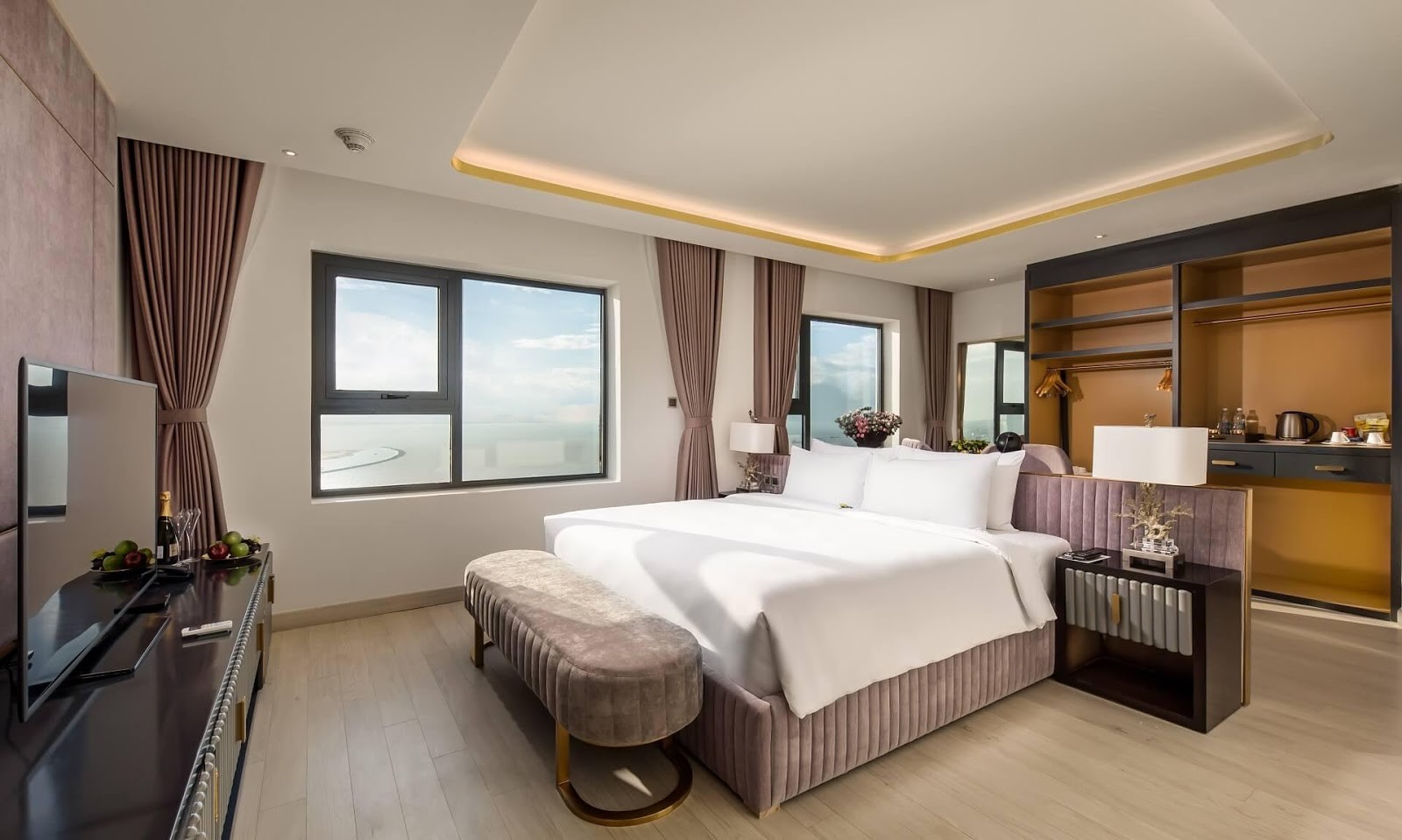 Khách sạn gồm 208 phòng có góc nhìn hướng biển, nội thất cao cấp và nhiều dịch vụ như Infinity pool, sky bar, spa... tạo không gian thoải mái, tiện ích cho du khách khi đến nghỉ dưỡng.