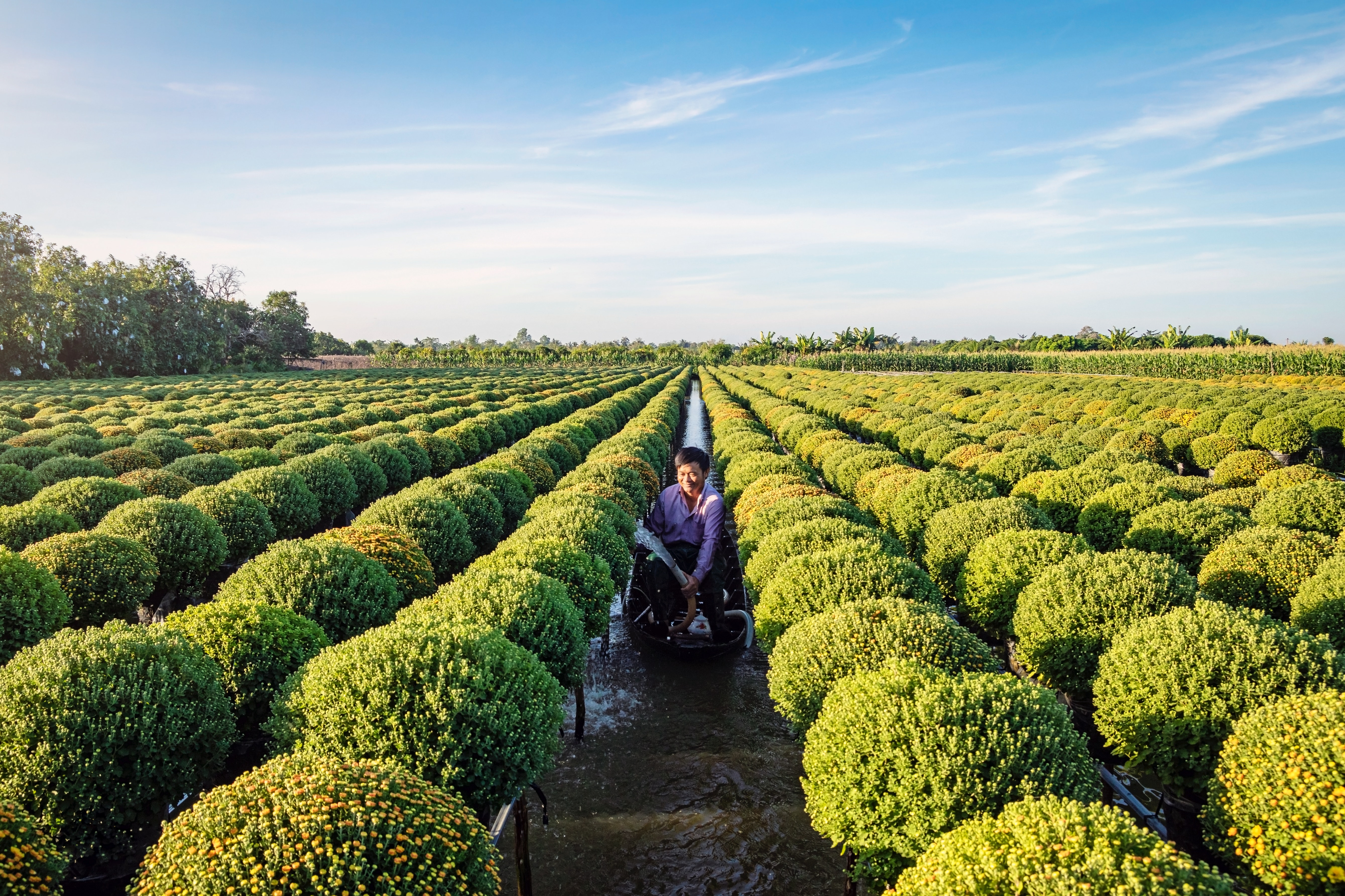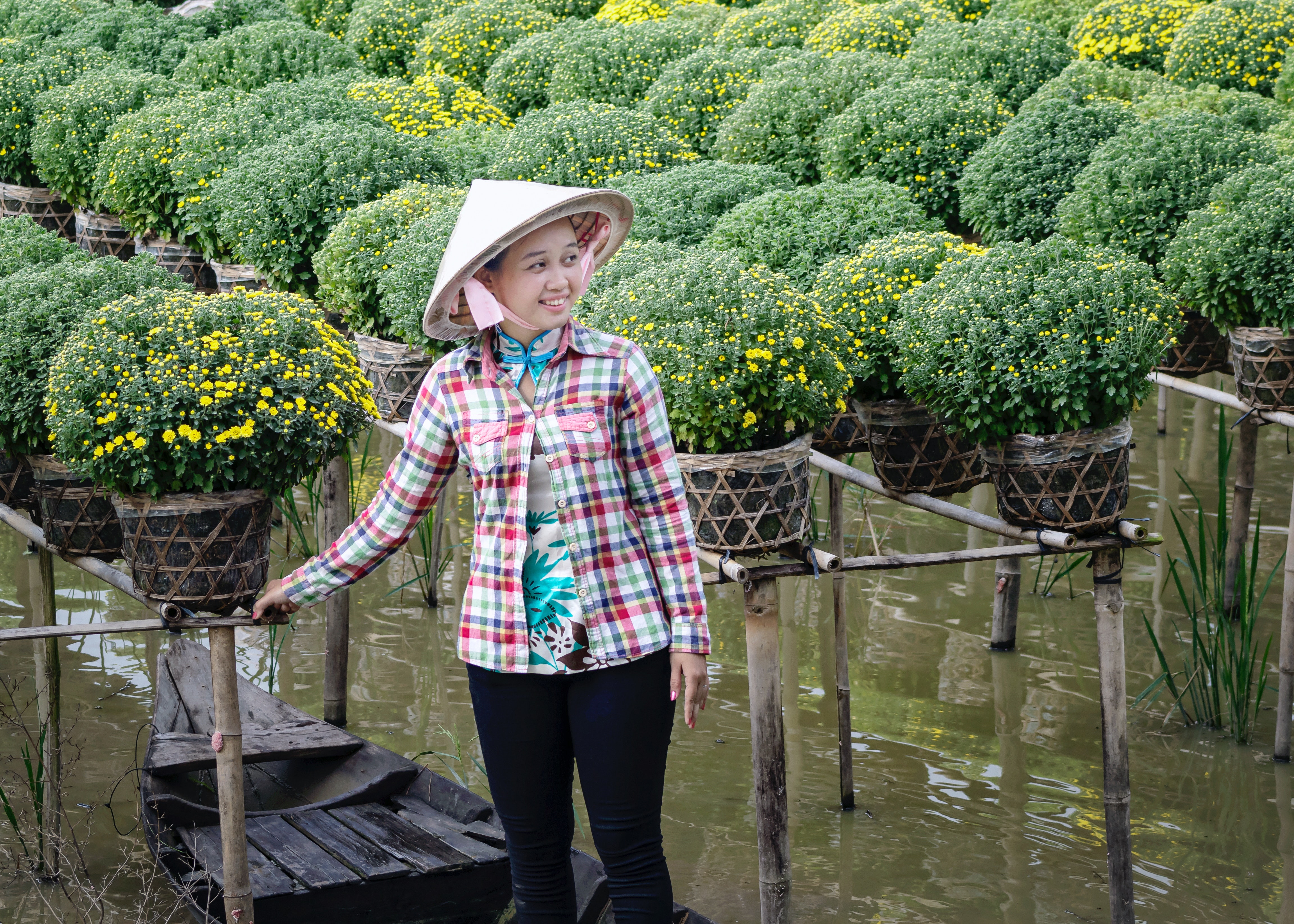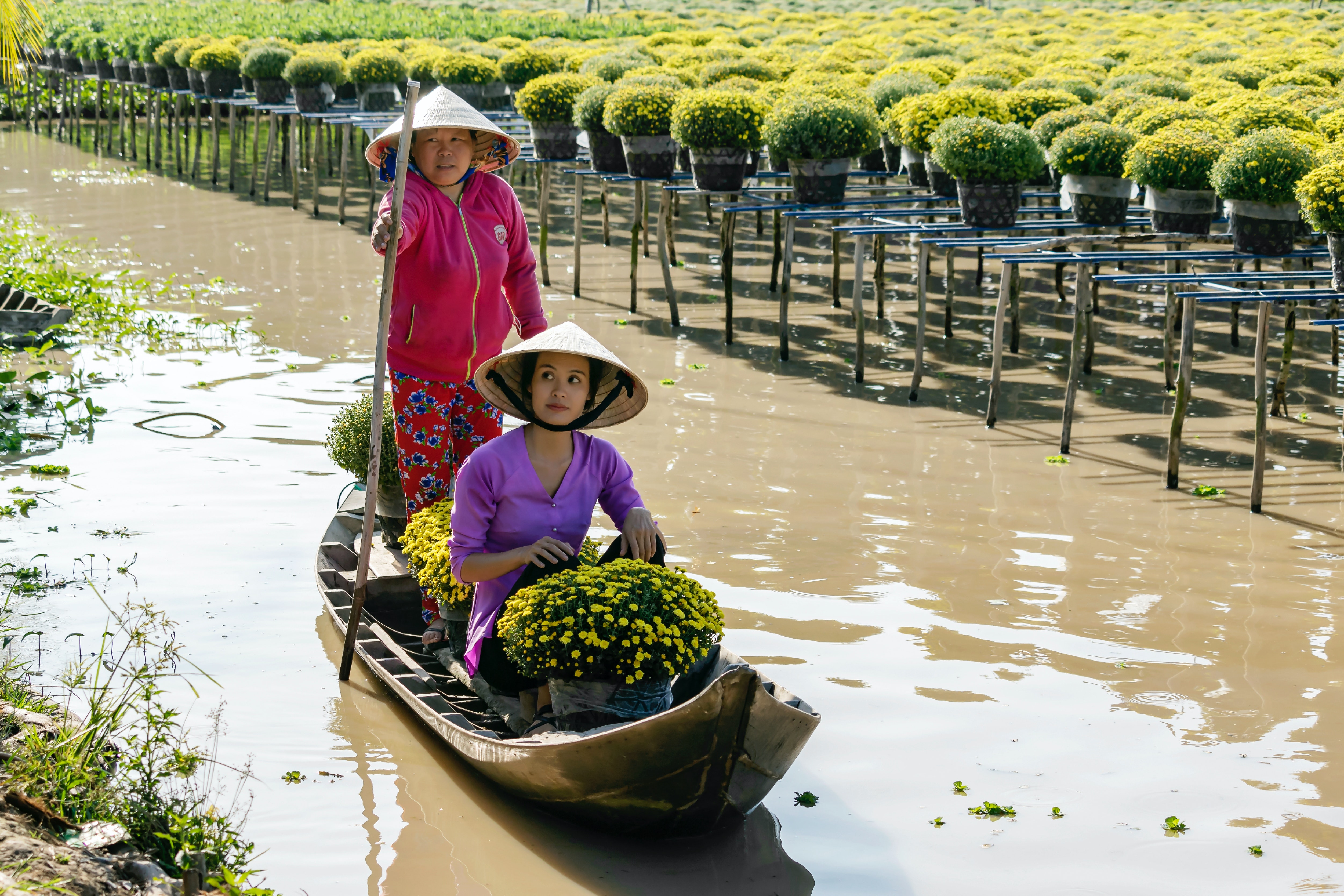 Không giống với hình ảnh làng hoa thẳng tắp đều luống thường thấy ở miền Bắc, ở làng hoa Sa Đéc bạn sẽ được nhìn thấy hình ảnh đặc thù sông nước miền Tây với những kênh rạch nhỏ xinh khéo léo điểm tô vài luống hoa sắc màu. Vốn là vùng sông nước, hoa ở Sa Đéc thay vì được trồng dưới đất lại được trồng trên giàn cao các mặt đất và dẫn nguồn nước từ sông rạch chảy vào, tạo nên cảnh tượng độc đáo đến không ngờ. Mỗi khi thủy triều dâng cao, người dân nơi đây sẽ chèo những chiếc ghe nhỏ đi chăm sóc và thu hoạch từng khóm hoa căng tràn nhựa sống vào bờ để đi bán. Đây cũng chính là cách trồng hoa đặc trưng của người miền Tây!