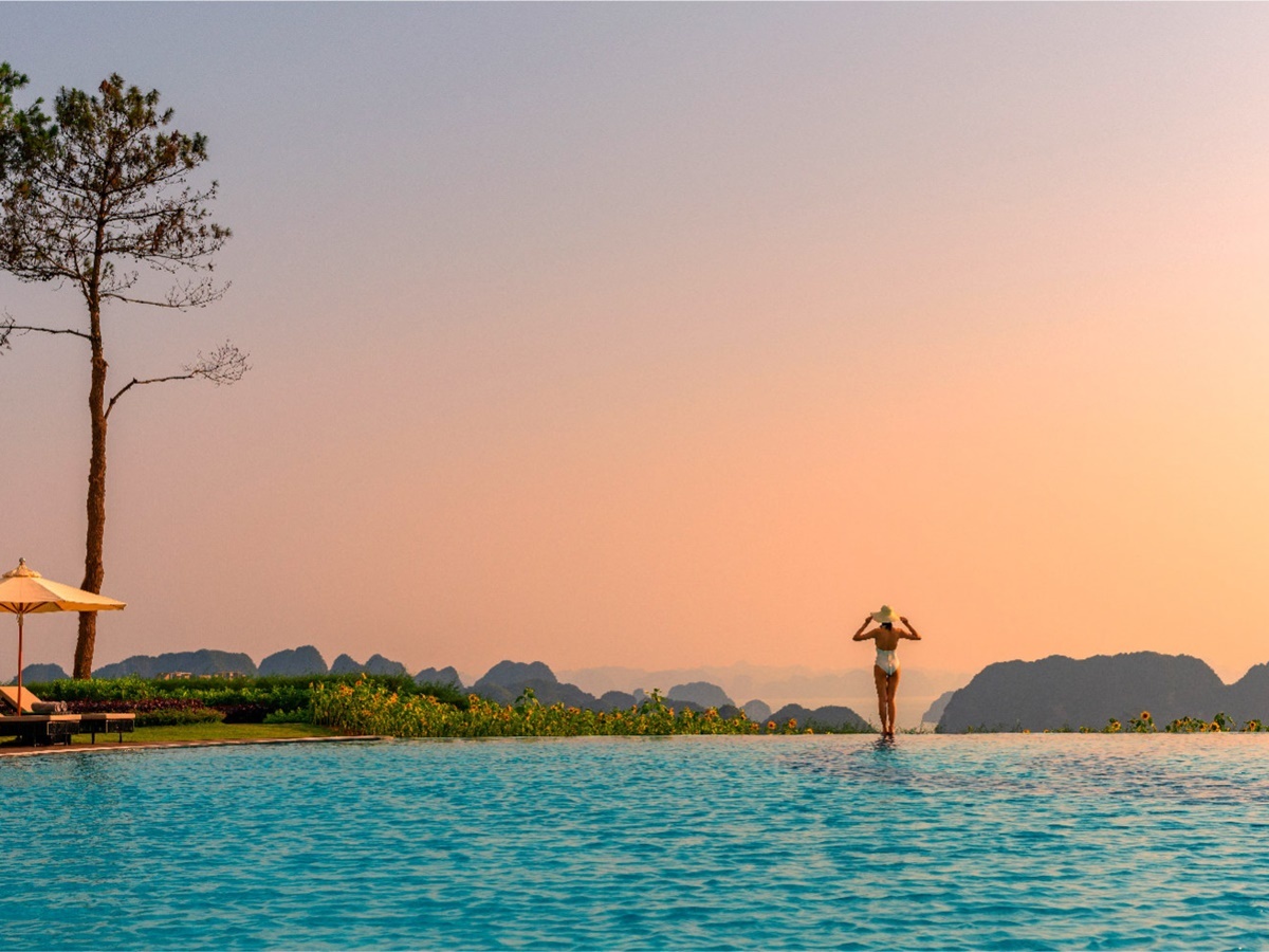 Thêm một trải nghiệm hấp dẫn nữa dành cho du khách ghé thăm Hạ Long, đó là bể bơi vô cực ngoài trời trong khách sạn 5 sao FLC Grand Hotel. Với tầm nhìn bao quát toàn bộ khu nghỉ dưỡng, thành phố sầm uất và vùng vịnh phía xa, nơi đây hứa hẹn là điểm đến lý tưởng để du khách chiêm ngưỡng trọn vẹn khung cảnh hoàng hôn phủ màu diễm lệ ở Hạ Long.