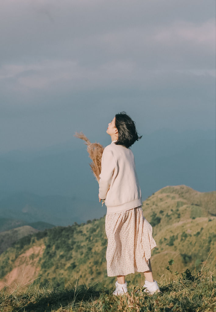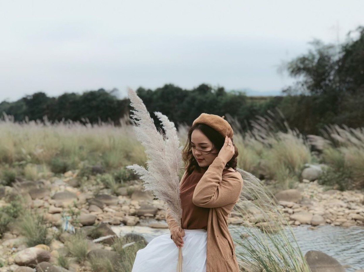 - Để set đồ của bạn trông đẹp và trở nên trendy hơn, hãy thử mix áo cardigan với váy hoa có cùng 1 gam màu nhé. Phía dưới có thể mix thêm một đôi giày Mary Jane hot trend hoặc một đôi giày thể thao năng động nếu không muốn quá bánh bèo với bức hình bên đồi cỏ lau.