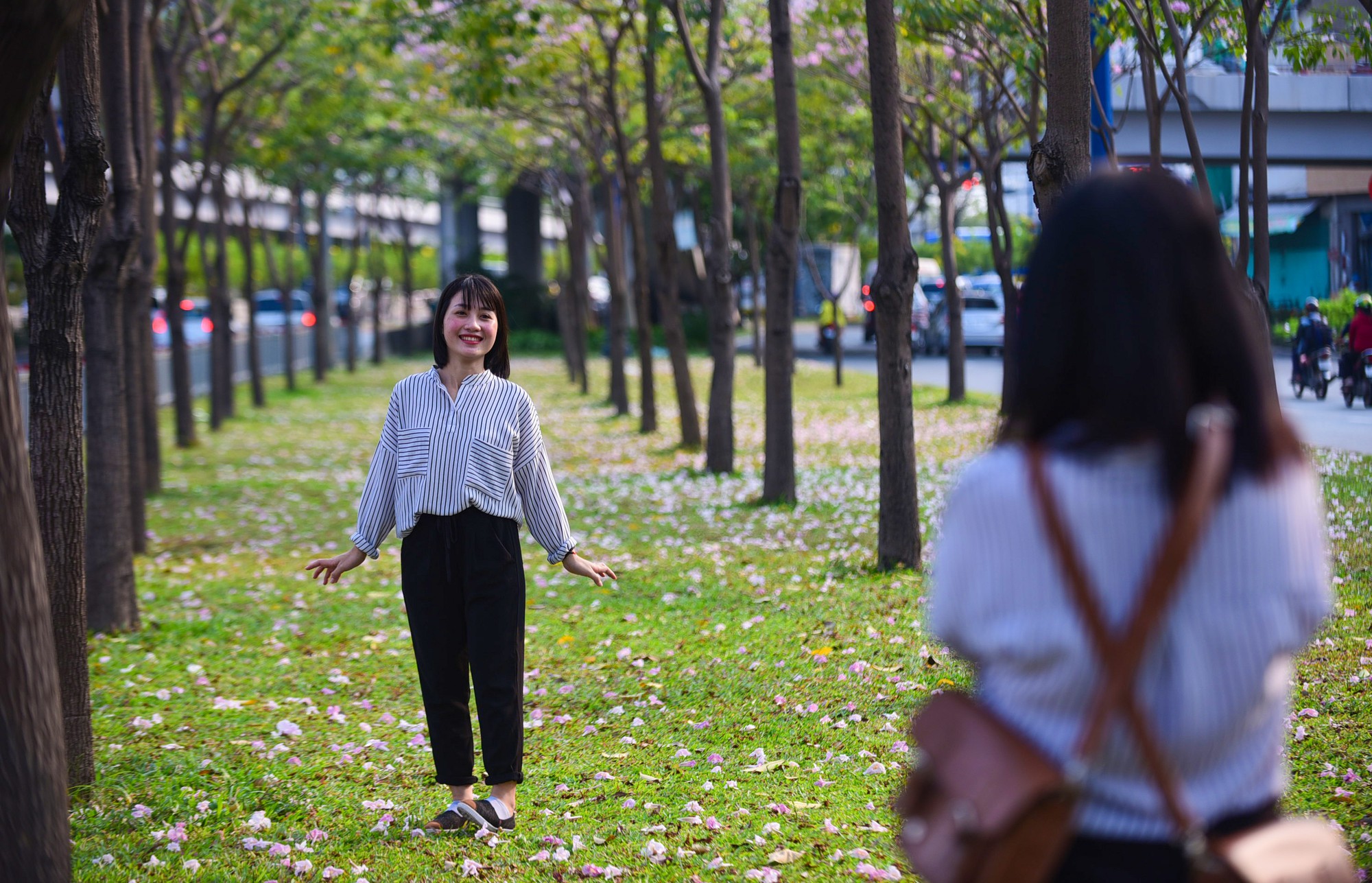 Khá đông bạn trẻ tìm đến đây để “check in” với những tán hoa hồng rực cả một góc trời. Địa điểm quen thuộc khác cho những người yêu quý hoa kèn hồng là đại lộ Võ Văn Kiệt với ba hàng cây song song trồng trên bãi cỏ khá rộng. Nhiều bạn trẻ đã tranh thủ tới đây "sống ảo" trong những ngày hoa nở rộ nhất.
