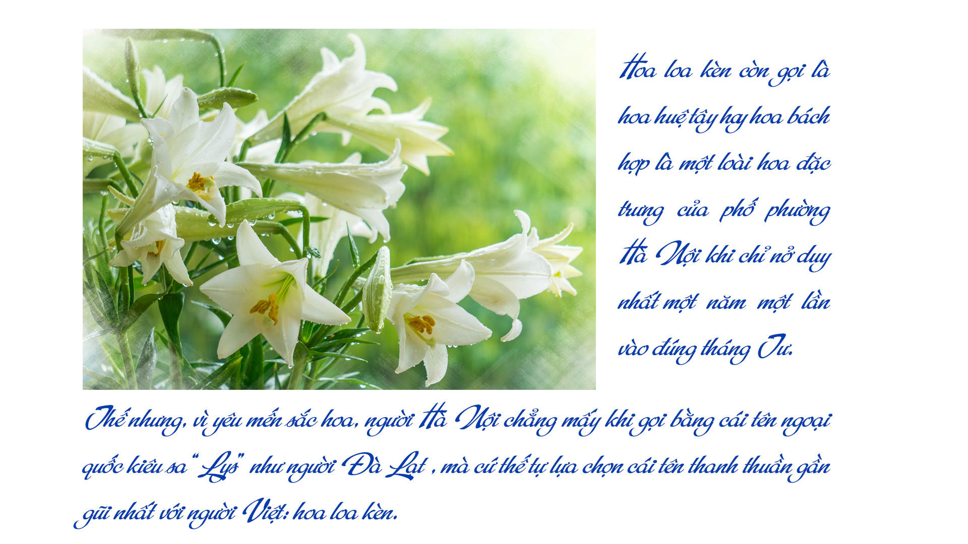 Trước đây, chỉ có vùng đất cao nguyên - Đà Lạt quanh năm phủ đầy gió sương mới có thể trồng được hoa loa kèn. Ngày nay, hoa loa kèn đã được người Hà Nội đưa về trồng ở những vựa hoa lớn nhất ngoại ô thành phố: Tây Tựu (Bắc Từ Liêm), Quảng Bá, Nhật Tân (Tây Hồ),… Chẳng thế mà “kèn ta” bông nào bông nấy thuôn nhỏ, mỏng manh vừa phải, mỗi khi bung nở lại chuyển sang màu trắng tinh khiết, tỏa hương dịu nhẹ vấn vương cả dãy phố.