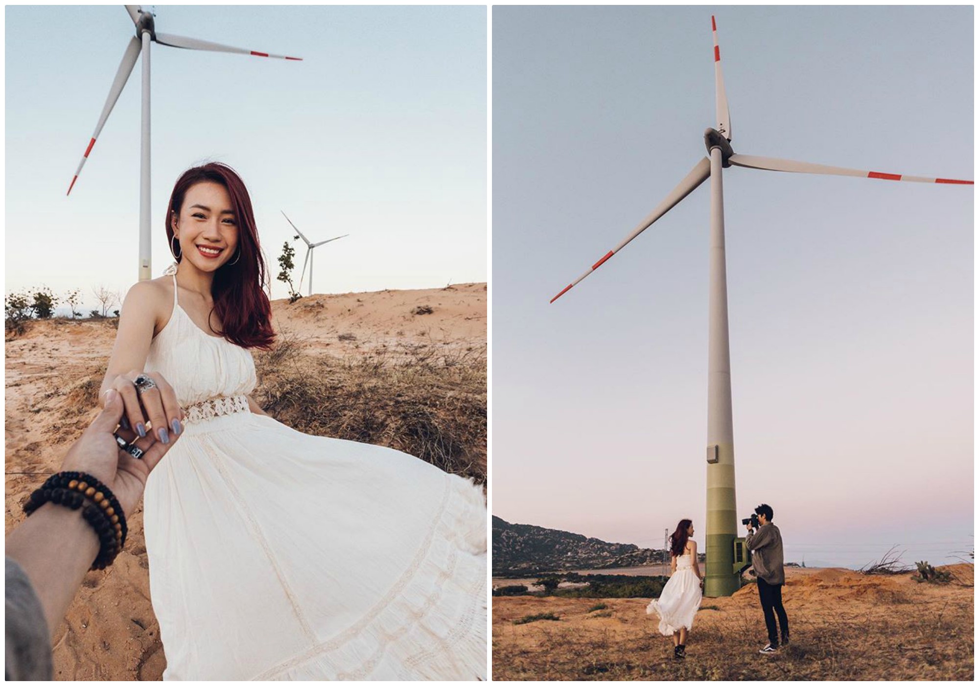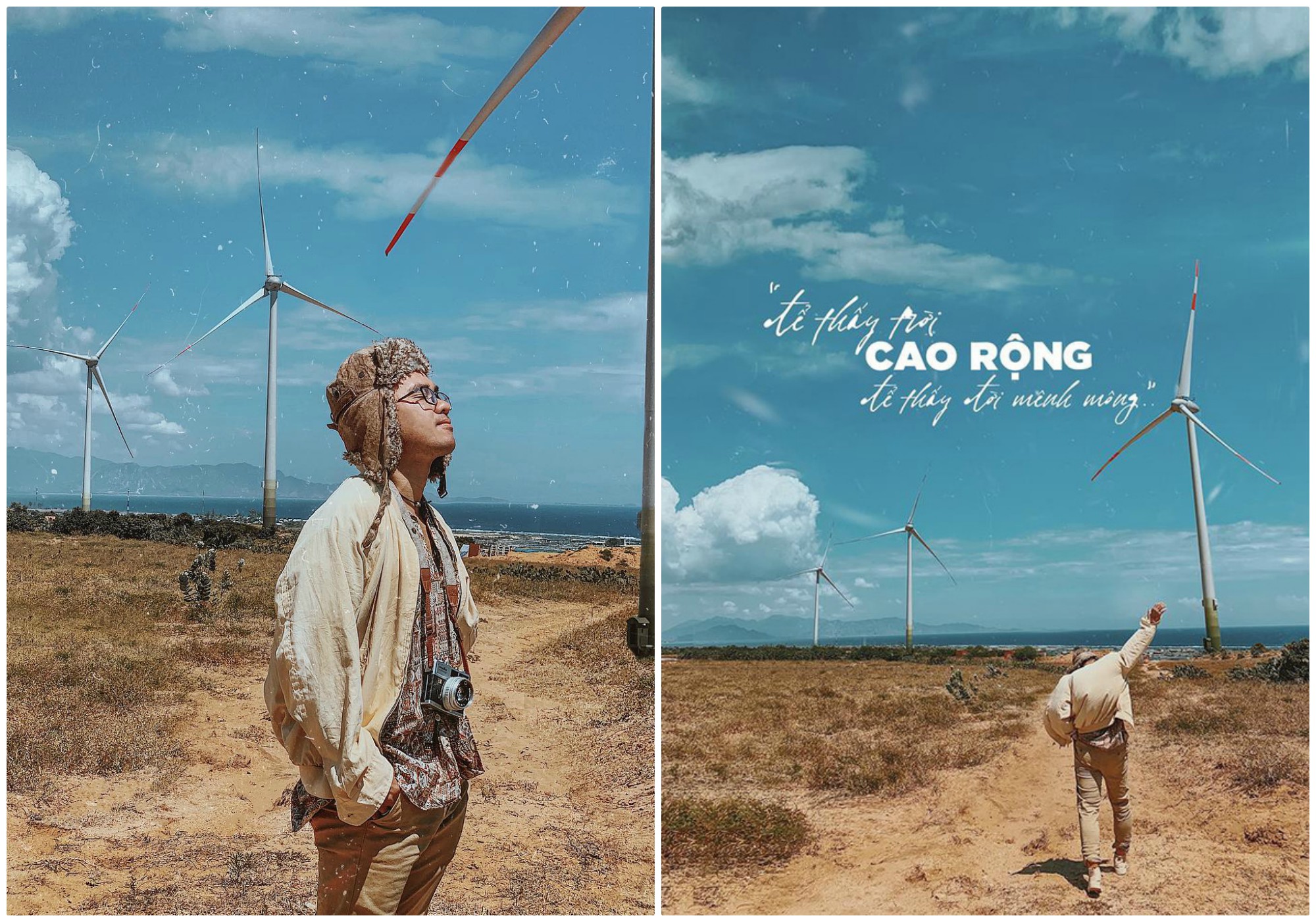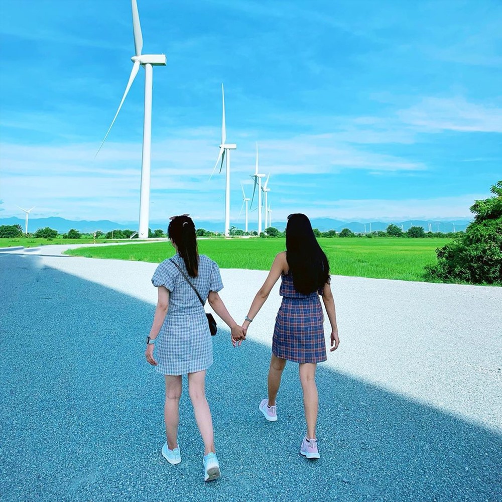 Những tua-bin như chong chóng khổng lồ quay trên nền trời xanh, chỉ cần giơ máy ảnh lên là du khách đã có ngay được những bức ảnh tuyệt đẹp cùng cột điện gió Mũi Dinh.
