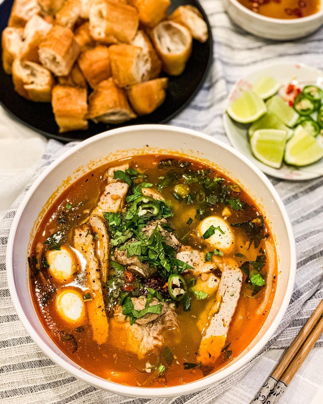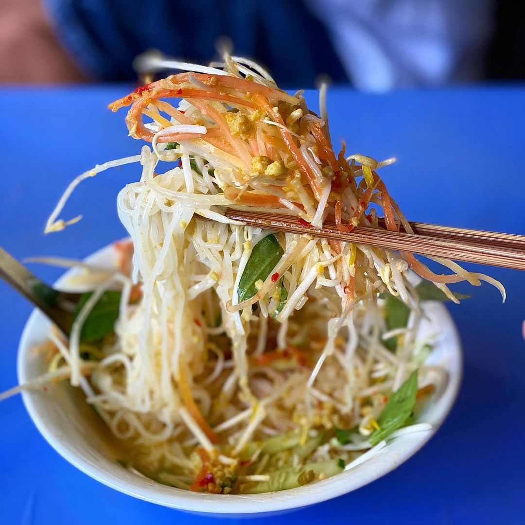 Một tô bún đầy đủ có màu xanh của rau thơm, màu trắng của bún và giá, màu vàng của cà ri, màu đỏ của ớt, màu cam của đu đủ chỉ nhìn thôi đã thấy hấp dẫn. Ảnh: Travelmag