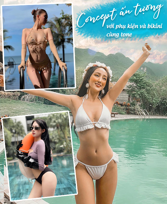 Trang phục để chụp những bức hình đẹp nhất ở bể bơi thì chắc chắn là bikini rồi. Nếu như bạn không ngại khoe vóc dáng của mình, thì hãy sắm ngay một bộ bikini thật sexy, gợi cảm. Ngoài ra, bạn cũng có thể chọn trang phục mềm mại, thướt tha hay những bộ trang phục cá tính "trendy" và những món đồ đi kèm phù hợp khung cảnh để tạo nên tổng thể hài hòa và bắt mắt.
