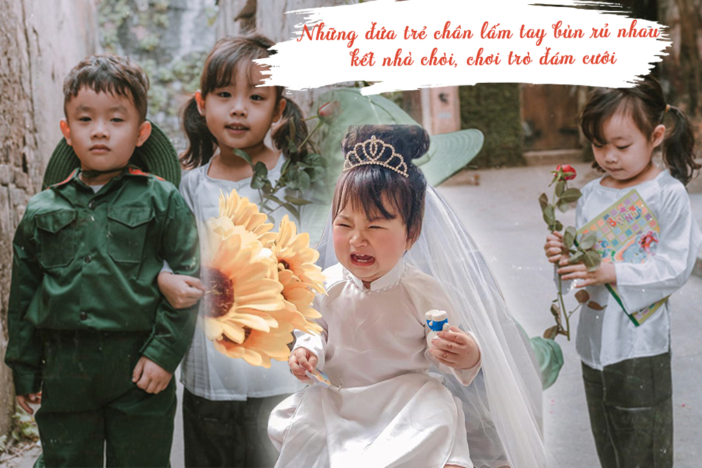Cái trò giả làm đám cưới của tụi trẻ thời xưa sao bây giờ nhớ lại mà thấy đáng yêu và trong sáng đến thế. Chẳng cần phải mâm cao cỗ đầy, nhưng nhất định cô dâu phải thật lộng lẫy với đủ các loại hoa cỏ gắn vô tội vạ từ đầu đến chân.