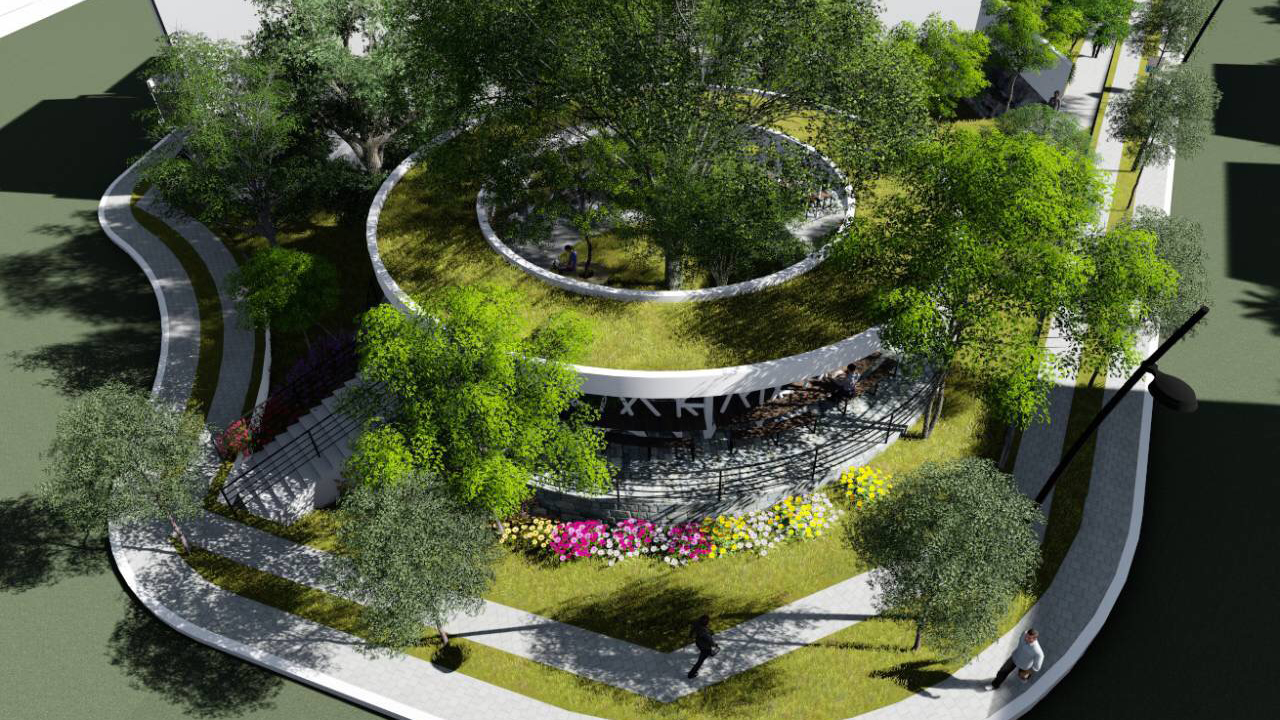 Vẫn là gam màu trắng tinh phủ lên những bức tường và thanh chắn cố định, tạo nên một không gian độc đáo và lạ lẫm. Từ trên cao nhìn xuống, khu vườn tròn như một chiếc bánh donut, nằm giữa những tòa nhà đủ sắc màu.