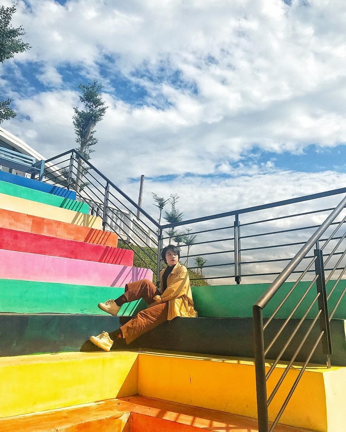 Chẳng cần đi đến tận nước ngoài, bạn cũng có thể bắt gặp những bậc thang rực rỡ màu sắc cầu vồng khi đến vui chơi tại khu dân cư này. Thật thú vị khi chẳng cần làm gì nhiều đâu, cứ ngồi vào background này là có ngay hình xịn mang về rồi.