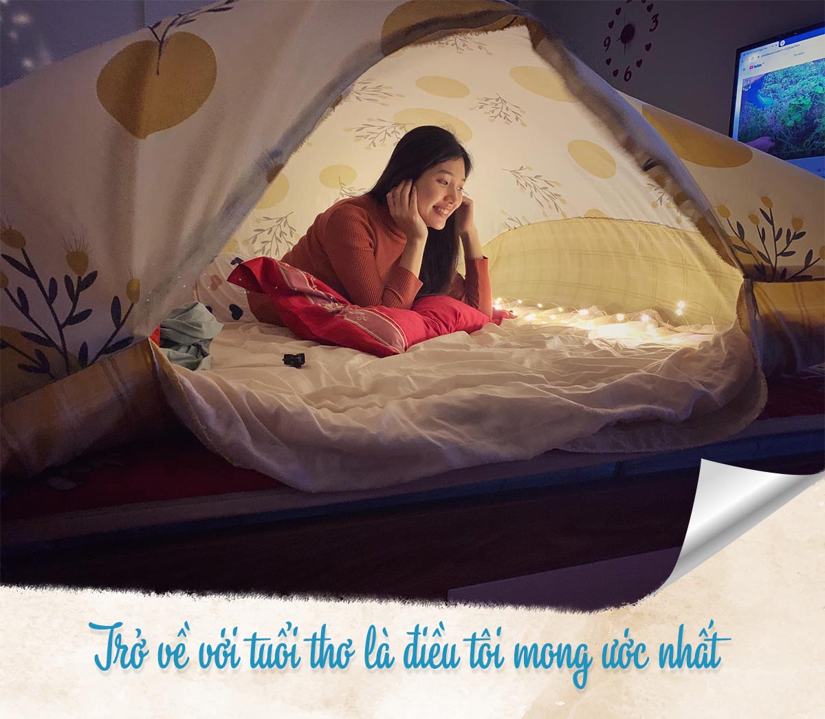 Không sở hữu góc chill quá hoàn tráng, nhưng với Hoàng Minh Phương thì camping tại gia như giúp cô trở lại những tháng ngày thơ bé. Những kỷ niệm tưởng chừng như đã ngủ quên, nhưng dần dần sống lại khi Minh Phương làm góc “camp” cực đặc biệt như thế này.