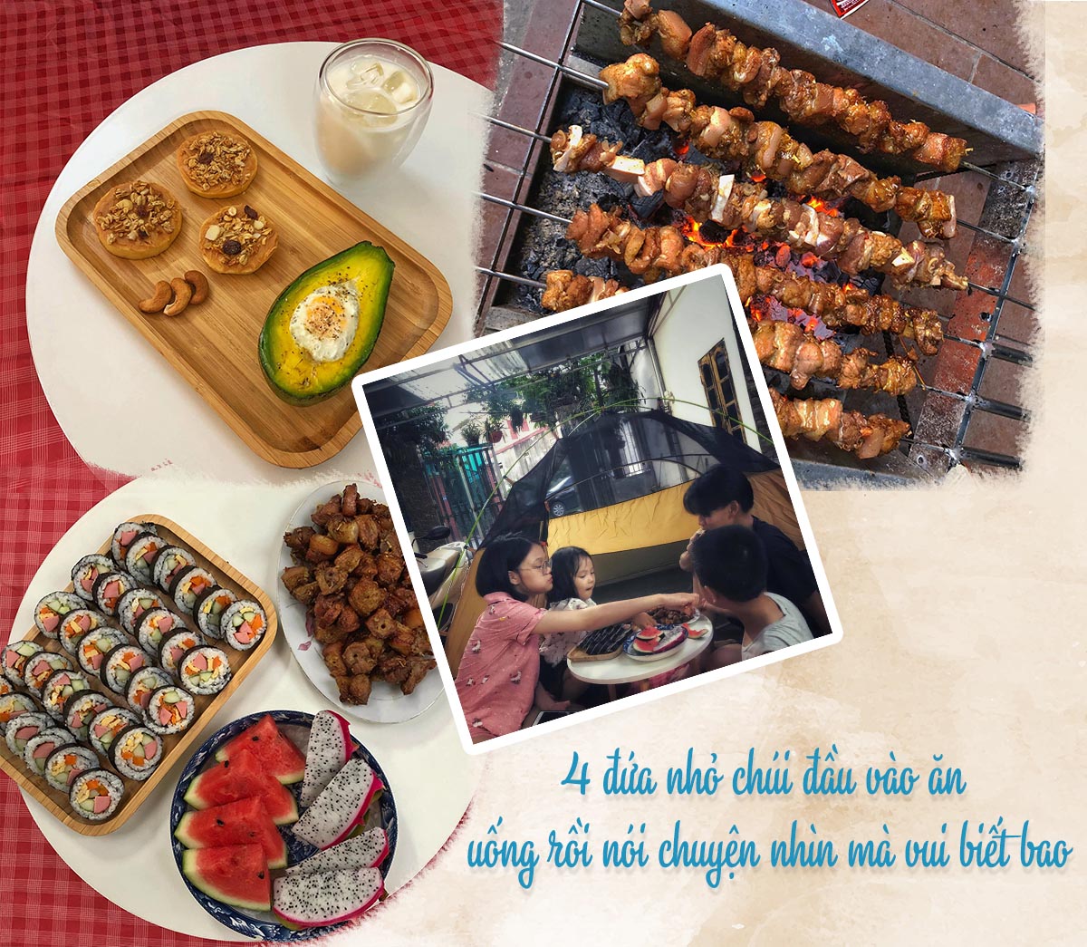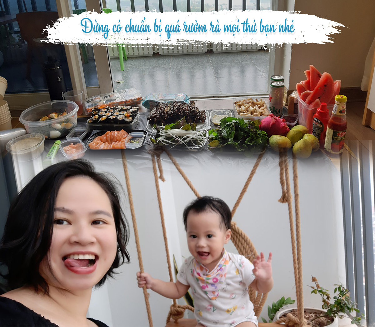 Chị Thùy Linh luôn cảm thấy việc tổ chức bữa “Home Camping” là việc làm rất thiết thực và ý nghĩa. Bà mẹ này đã chuẩn bị cho con mình đầy đủ cả hoa quả giải nhiệt mùa hè, kimbab cuộn theo kiểu Hàn Quốc, trứng bơ và cả thịt nướng nữa.