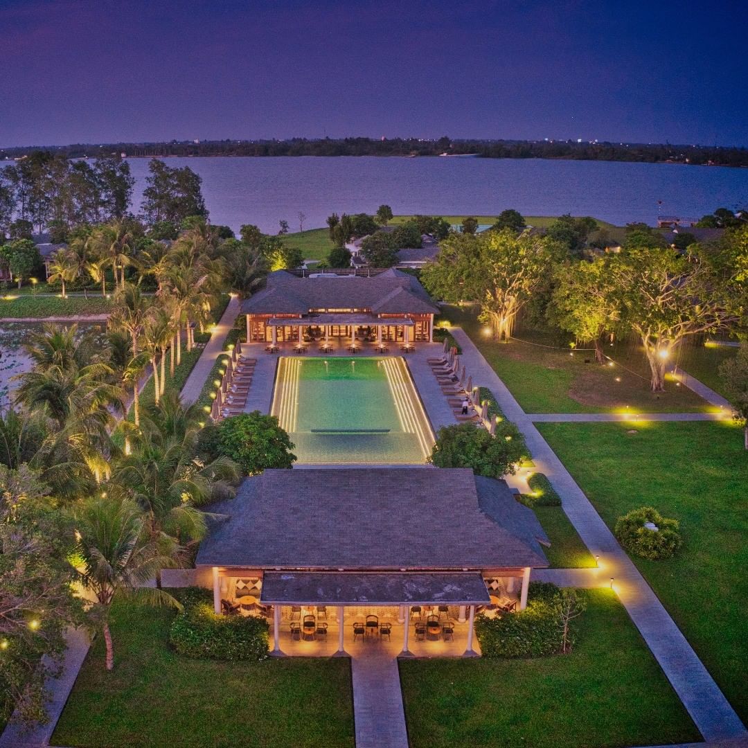 Khu resort hiện đại được thiết kế gần gũi với thiên nhiên, không gian xanh thanh bình hiếm có. Quanh toàn bộ khu nghỉ dưỡng là những vườn cây xanh mát, thoáng đãng, tạo không khí dễ chịu ngay khi bạn đặt chân tới nơi đây. Đặc biệt, với vị trí giữa cồn đảo, bao quanh là dòng sông Hậu nên Azerai Resort Cần Thơ lúc nào cũng mát mẻ, bình yên.