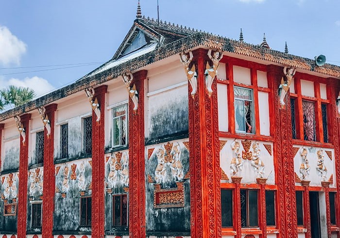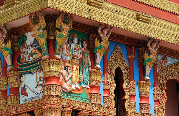 Đi dọc bên ngoài tòa nhà, bạn sẽ được ngắm nhìn những bức bích họa, tượng đắp nổi với đủ sắc màu rực rỡ. Đó là hình ảnh miêu tả chân thực và sinh động về những câu chuyện liên quan đến cuộc đời Đức Phật.