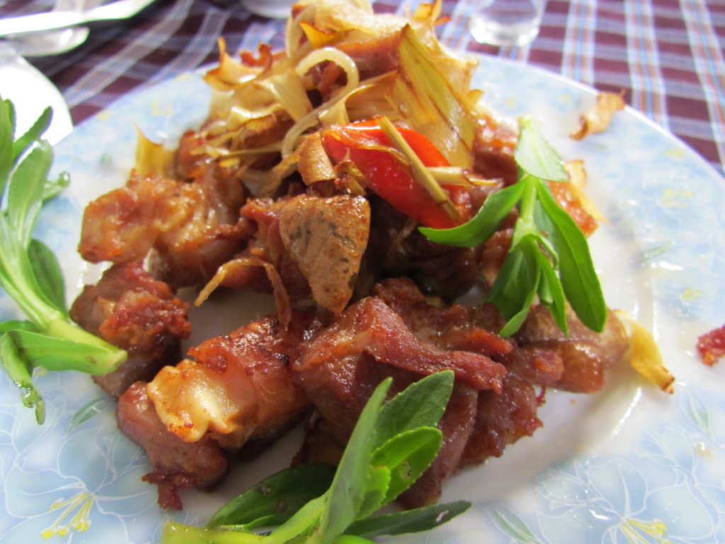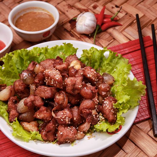 Từng miếng thịt bê xắt nhỏ nêm nếm gia vị vừa vặn xào nhanh trên chảo dầu sôi sục nóng hổi khi chín toát ra mùi thơm lừng của thịt kèm với hương vị cay nồng của gừng sả đi kèm. Dọn nhanh ra đĩa kèm với chút gừng, sả vàng ruộm bày trong đĩa, thớ thịt mềm ngọt cùng lớp bì giòn tan dai nhẹ càng khiến thực khách thấy thơm ngon lạ kỳ. Chấm nhẹ trong bát nước tương sánh mịn cùng chút rượu nồng sẽ thấy ấm người giữa cao nguyên lạnh giá hơn bao giờ hết.