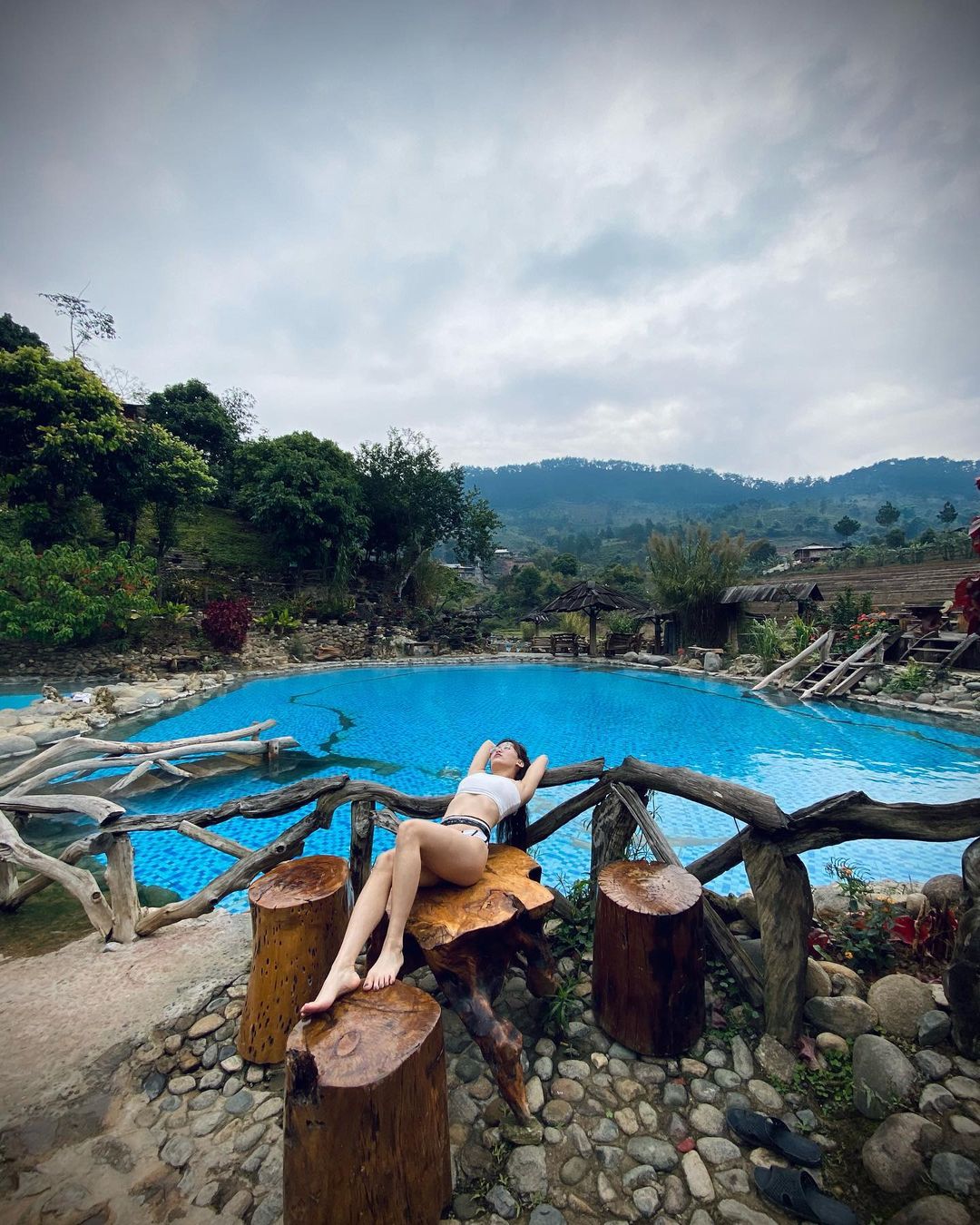 Khu vực hồ bơi được trang trí bằng nhiều viên đá lớn nhỏ xếp đan xen nhau. Giữa các hồ được bắc thêm cây cầu nhỏ bằng gỗ rất tiện cho việc di chuyển và là background đỉnh cao để bạn tha hồ thả dáng.