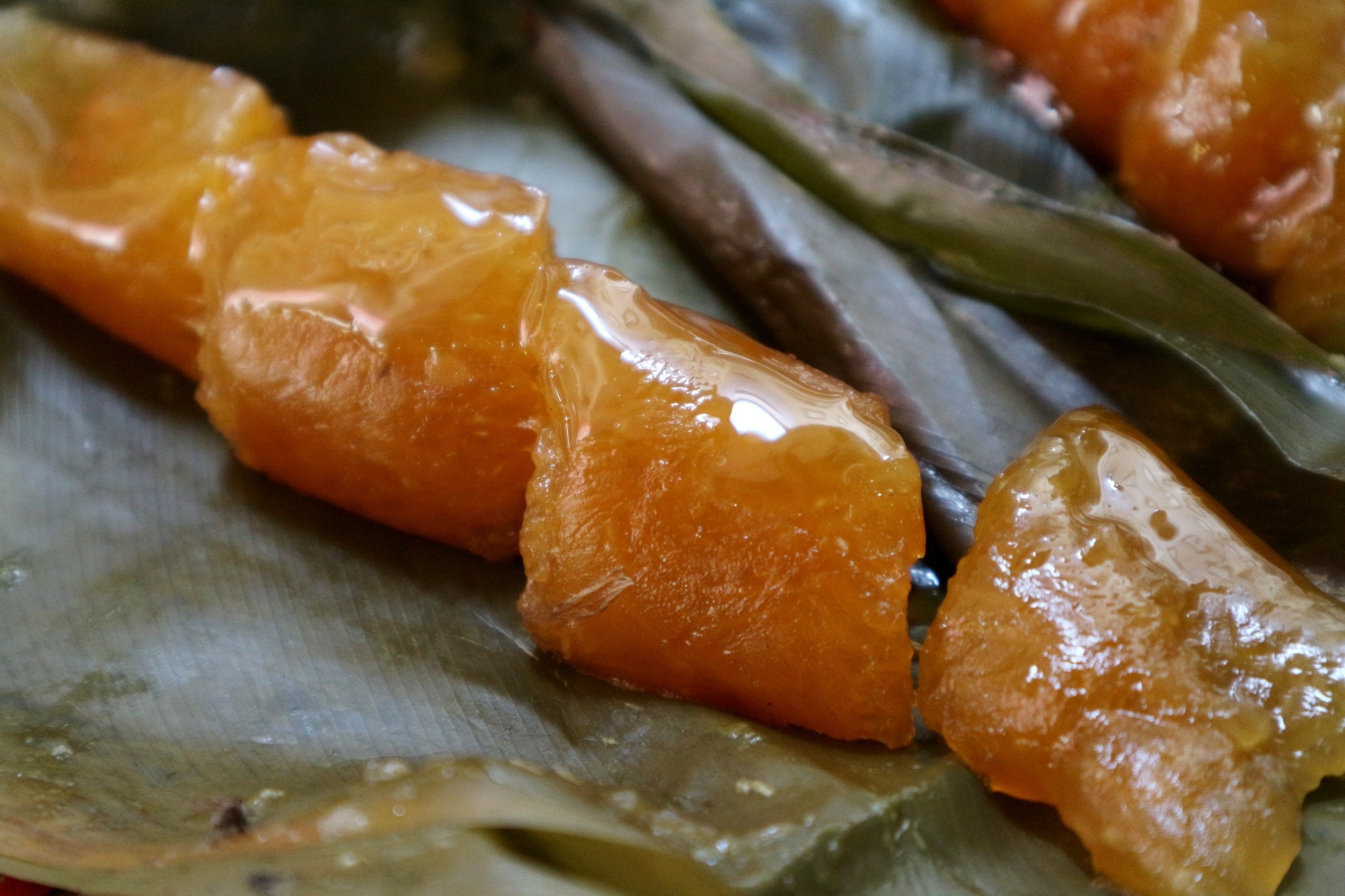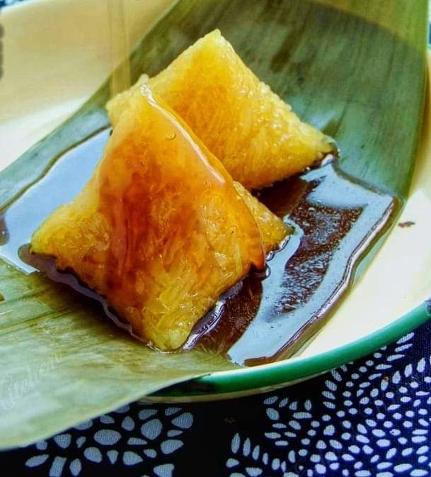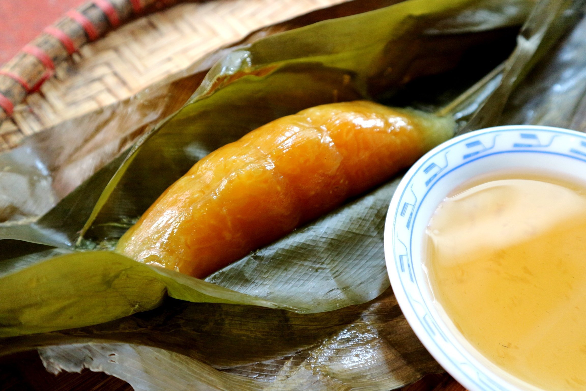 Bánh gio Bắc Kạn được làm từ gạo tẻ thơm nức xay nhuyễn gói kèm nhân đậu xanh bùi béo, chẳng thế mà mới bóc lớp vỏ ngoài ra đã thấy vỏ bánh vàng ươm dẻo thơm hấp dẫn vô cùng. Chấm cùng mật mía thanh ngọt càng khiến hương vị bánh quyện hòa vô cùng.