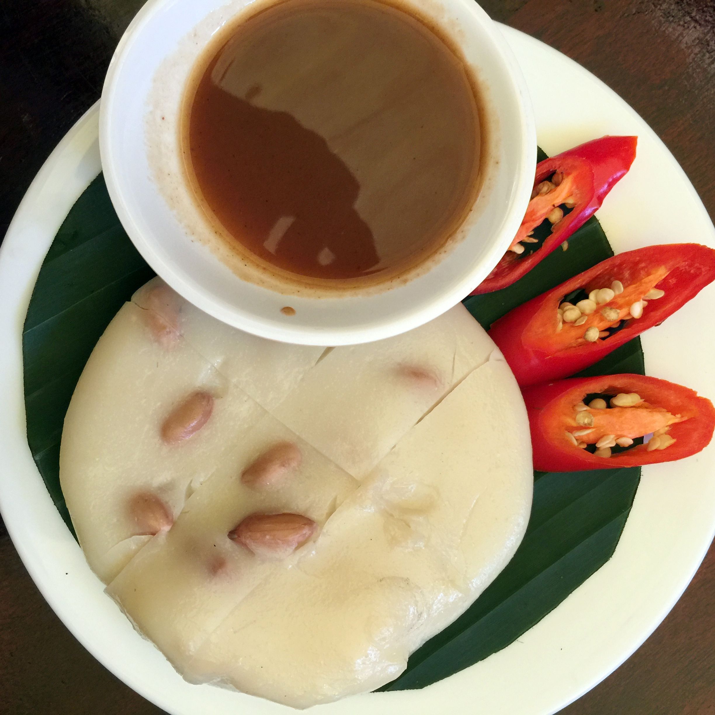 Từng miếng bánh đúc bóng mịn, lấm tấm mấy hạt lạc sần sật, mới nhìn qua đã thấy hấp dẫn. Chấm miếng bánh đúc ngọt béo trong lớp tương bần mằn mặn pha chút ngọt ngọt, hương vị xưa cũ dường như chưa bao giờ phai bớt trong tiềm thức.