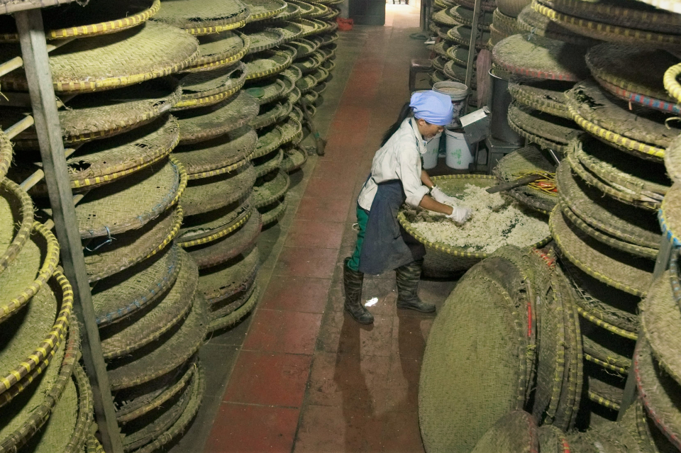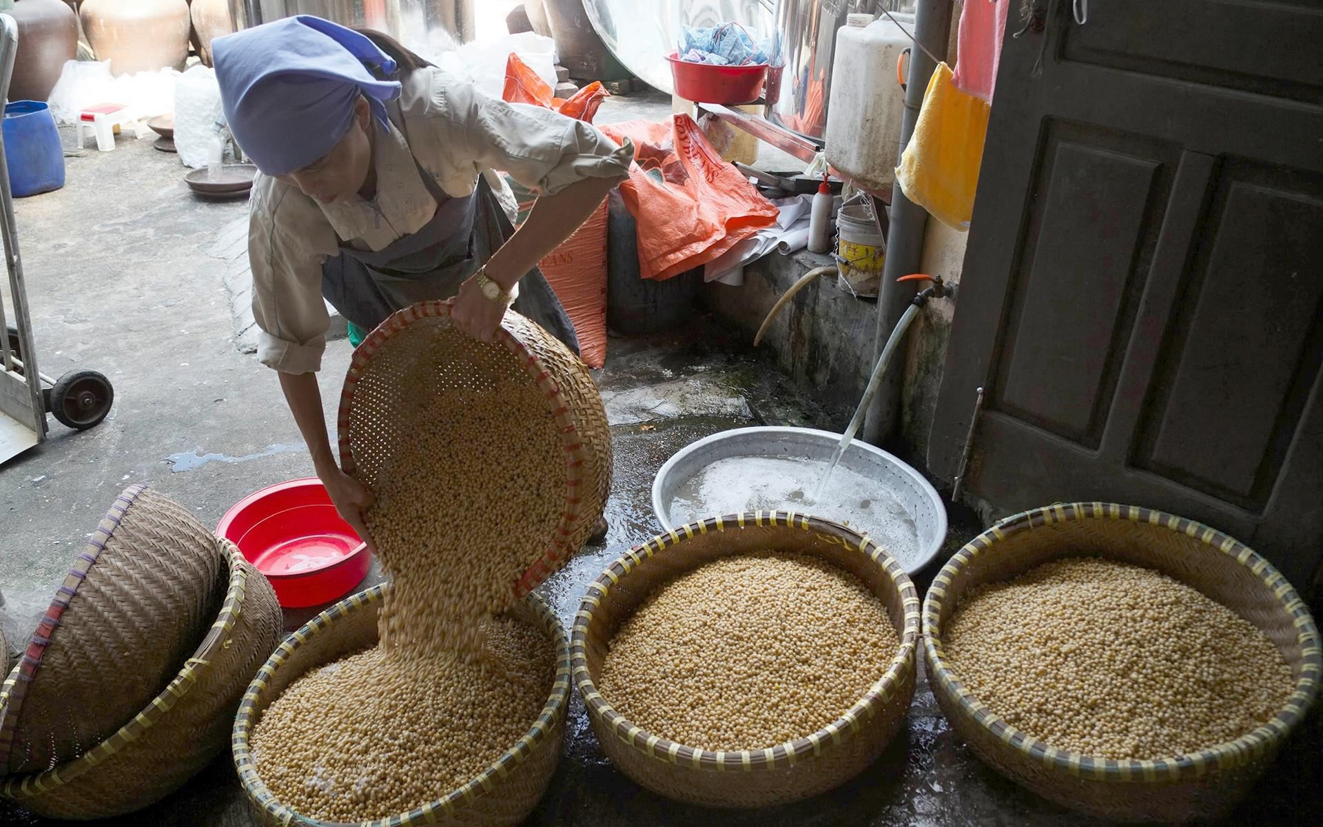 Tiếp đến sẽ lấy đỗ tương đem rang vàng. Trước đây, người thợ thường rang thủ công bằng chảo gang, đun dưới bếp củi, nhưng ngày nay họ đã chuyển sang dùng lò rang chuyên dụng để tăng hiệu quả. Đỗ tương rang xong đem xay nhỏ và ngâm trong chum sành với nước từ 7 đến 10 ngày (ngả đỗ) để nước đỗ lên màu vàng đỏ.