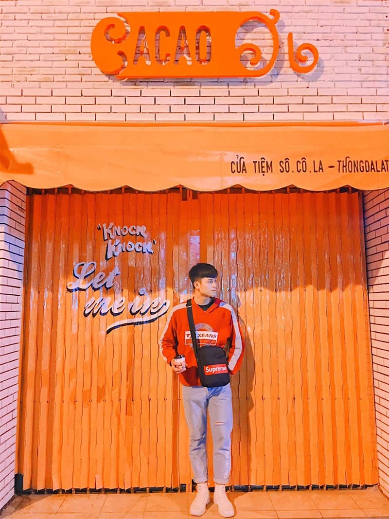 Cacao Ơi là tiệm kem chocolate xinh xắn ở xứ Đà Lạt với chiếc áo màu cam khoác lên mình nhỏ nhắn, rực rỡ, vô cùng bắt mắt. Đến đây thì chẳng cần làm gì cũng có bức ảnh sống ảo triệu like đem về.