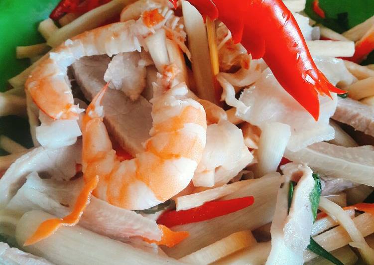 Sử dụng cây ngó lục bình còn tươi bào thành miếng mỏng, ngâm vào nước cốt pha chanh để giữ được vẻ tươi sáng và bóng giòn rồi trộn cùng với tôm luộc bóc vỏ, thịt ba chỉ luộc thái vừa ăn là đã có ngay món gỏi lục bình trộn tôm thịt. Gắp thử miếng thịt luộc, con tôm luộc kèm với miếng ngó lục bình chấm vào chén nước mắm ngọt dịu đưa lên miệng nhai chầm chậm. Hương vị ngọt béo ngầy ngậy của tôm thịt quyện hòa cùng mùi thoảng thơm đặc trưng của ngó lục bình chắc chắn sẽ khiến bạn quyến luyến món ăn dân dã thôn quê này lắm.
