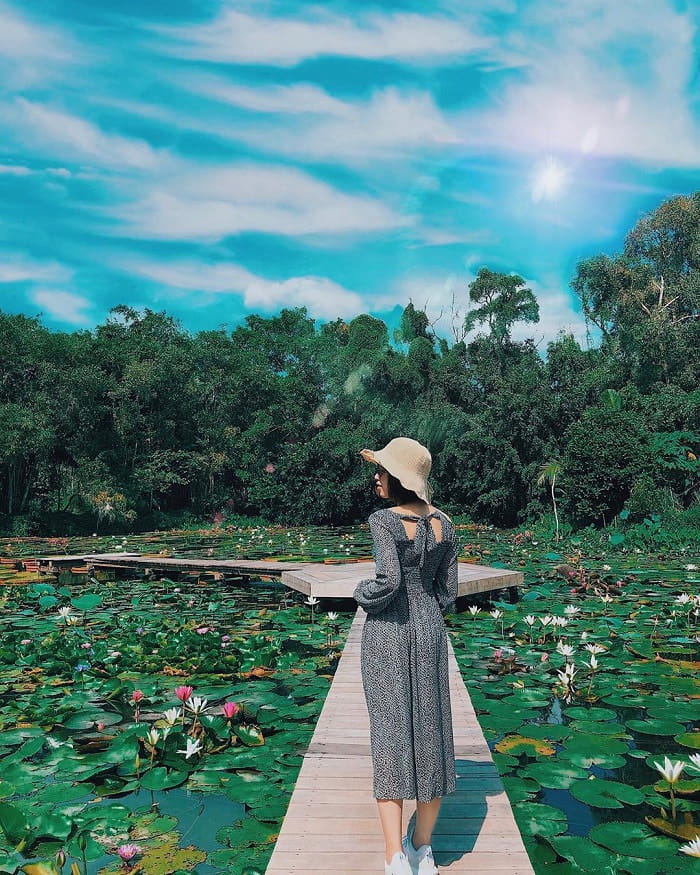 Nhưng có lẽ điều khiến người ta nhớ mãi là được ngắm nhìn mặt nước được phủ lên một màu xanh mơn mởn của bèo tây. Còn trên cao, các loài chim thi nhau bay lượn làm rợp cả một vùng nước mênh mông.