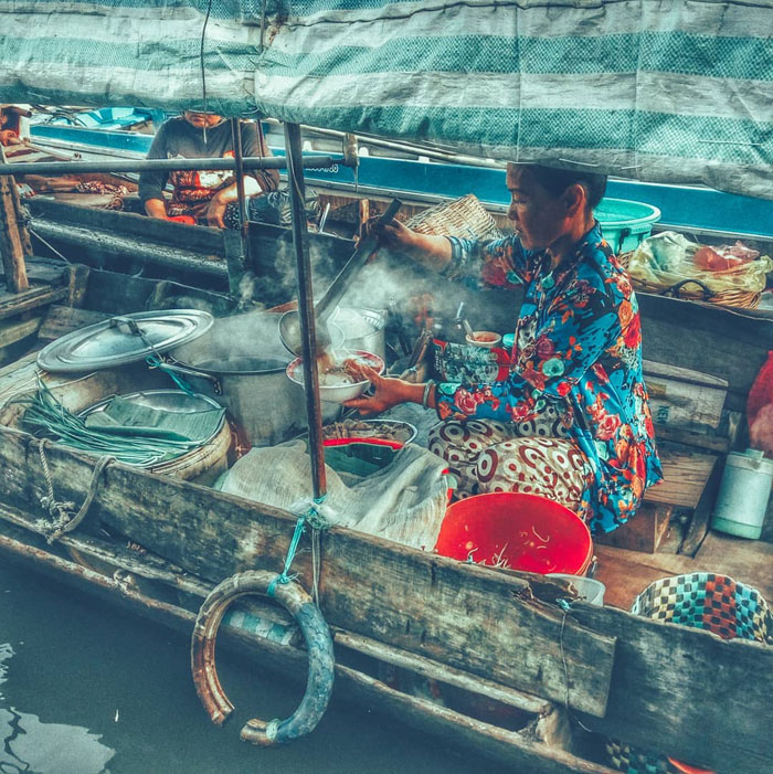 Tuy nhiên, có lẽ điều khiến nhiều du khách thích thú nhất lại ở chính trải nghiệm được thưởng thức các món ăn ngon củng Tây Nam Bộ như bún riêu, bánh canh, bánh xèo, bánh cuốn nóng, cháo lòng, hủ tiếu, phở, cà phê, nước ngọt… trên các ghe đang dập dìu sóng nước. Còn gì tuyệt vời hơn khi được ngồi trên xuồng ba lá, nghe các câu hò vọng cổ ngọt ngào và nếm thử các món ăn ngon miền Tây đúng không?