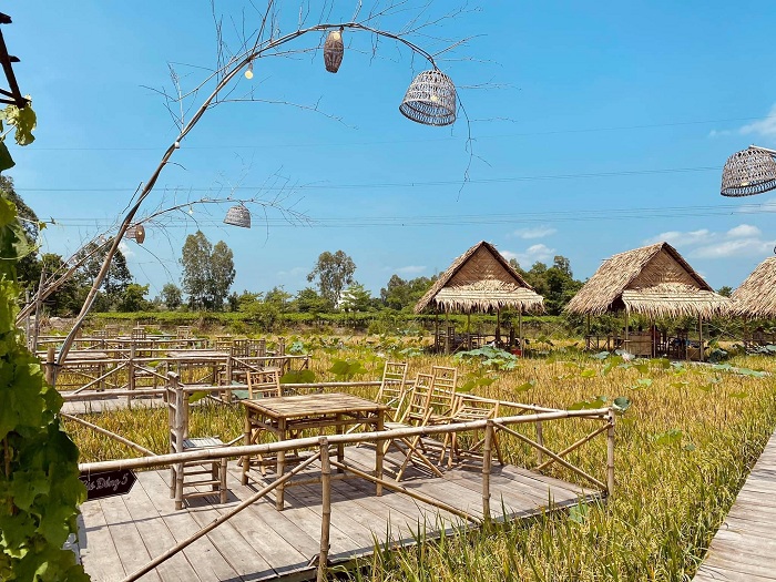 Tại khu du lịch Mỹ Phước Thành có nhiều hạng mục được đầu tư công phu, đáp ứng nhu cầu chụp ảnh, trải nghiệm của du khách. Đó là hệ thống cầu gỗ nối liền các chòi lá giữa đồng sen, có mái che mát rượi. Đó là những chiếc bàn ăn thiết kế hình xuồng vô cùng độc đáo.