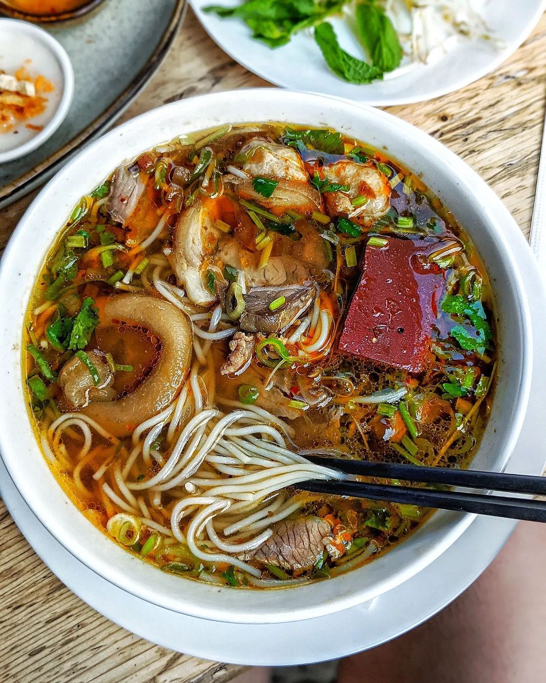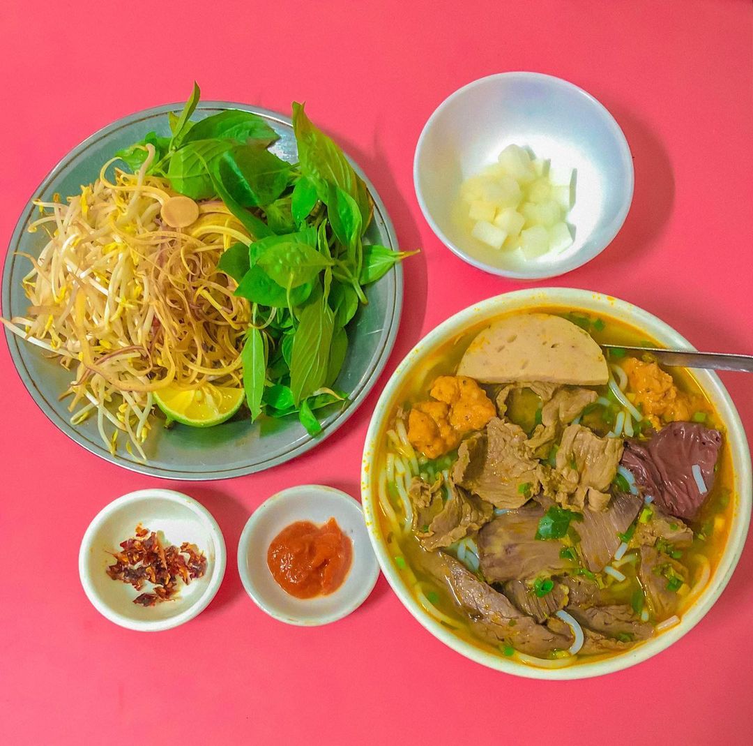 Những lúc đói bụng, khi bạn sà vào một quán ăn bán bún bò ở Huế ngon có tiếng sẽ bị mê hoặc bởi màu đỏ rực của ớt, cay đến chảy nước mắt nhưng ai cũng phải xuýt xoa vì quá ngon. Để trung hòa với vị cay của ớt và vị béo ngậy của thịt bò, khi ăn thực khách thường thưởng thức với rau sống, giá, rau húng, hoa chuối…