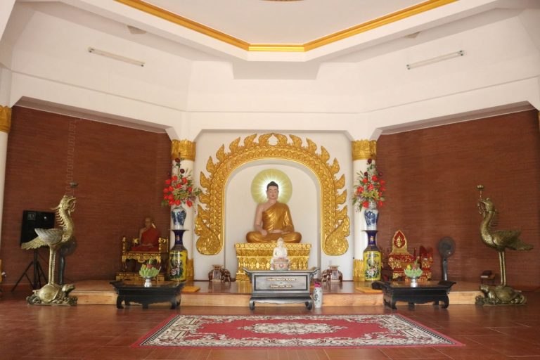 Bảo tháp chia thành 2 phần: bên dưới là chánh điện, bên trên là tôn thờ Xá Lợi Phật Thích Ca và chư Thánh Tăng. Không gian trong chánh điện trang nghiêm với các bức tranh về cuộc đời Đức Phật. Sau lưng là phòng khách và thiền thất.