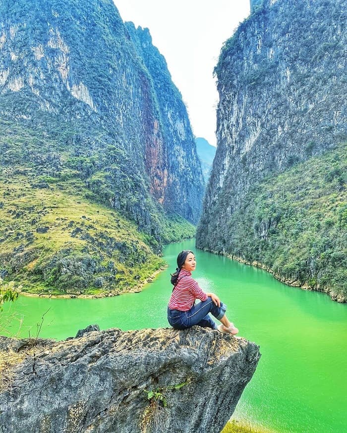Và đoạn dừng chân ở trên đèo Mã Pí Lèng – một trong “tứ đại đỉnh đèo” của Việt Nam với một bên là vách đá tai mèo cao vút, một bên là vực sâu cheo leo thăm thẳm, là đoạn đường được nhiều du khách chọn lựa làm điểm dừng chân ngắm dòng Nho Quế nhiều nhất. Một vẻ đẹp hóa chốn thần tiên khi hòa trộn cùng sương giăng mây mù lãng đãng là sợi chỉ xanh ngắt như bắc xuống từ trời đất, tạo nên cảm giác hư hư thực thực.