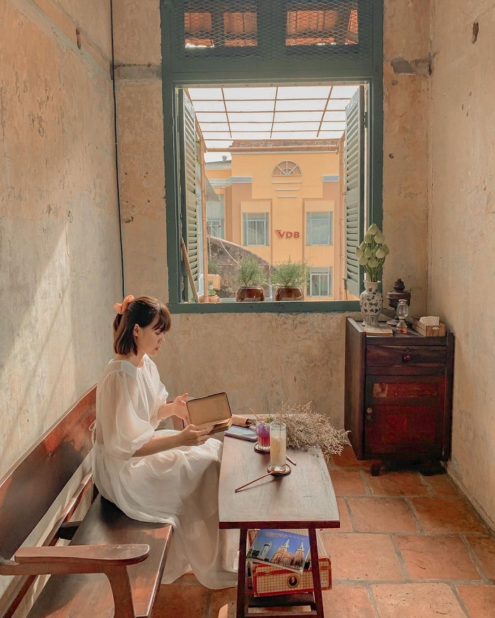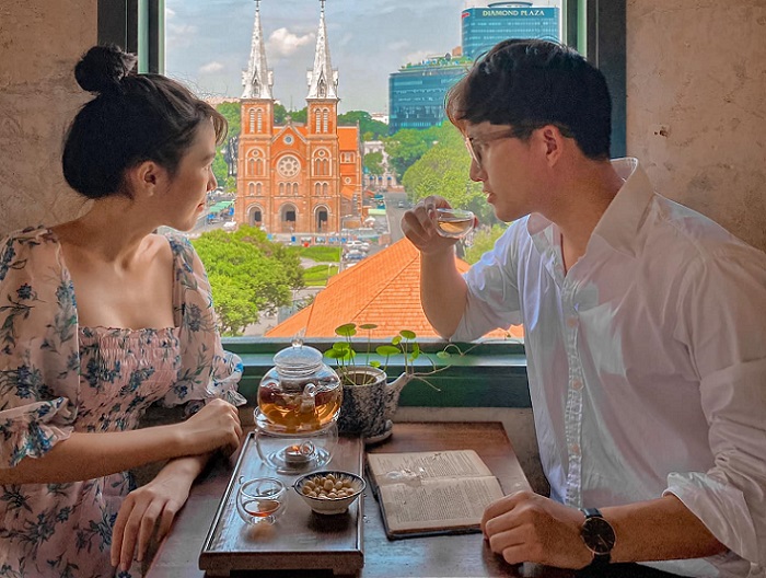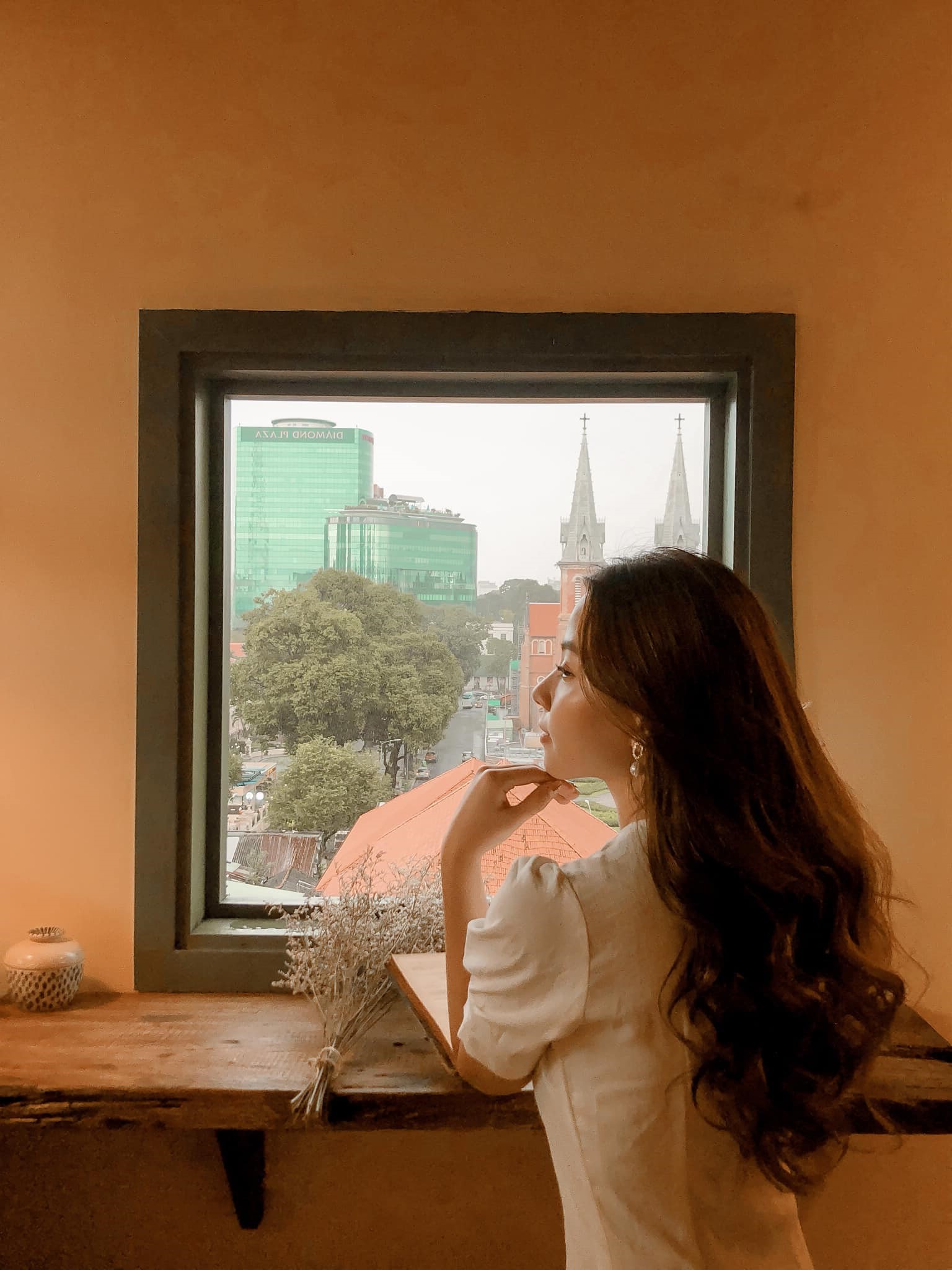 Còn để chụp hình thì có thể đến các quán cafe có view đẹp và sang, bạn có thể đến với Người Tám Chuyện House. Mặc dù quán cafe cũng trang trí đơn giản, nhưng những chiếc ô cửa sổ mới là điều đặc biệt, khi nhìn trọn vẹn được nhà thờ Đức Bà. Quán nằm thu mình trong một khu dân cư nhỏ ở 26 Lý Tự Trọng, phường Bến Nghé, quận 1. Hãy đến đây để dành những giây phút yên bình, dễ chịu và ngắm Sài Gòn kẻ qua người lại.