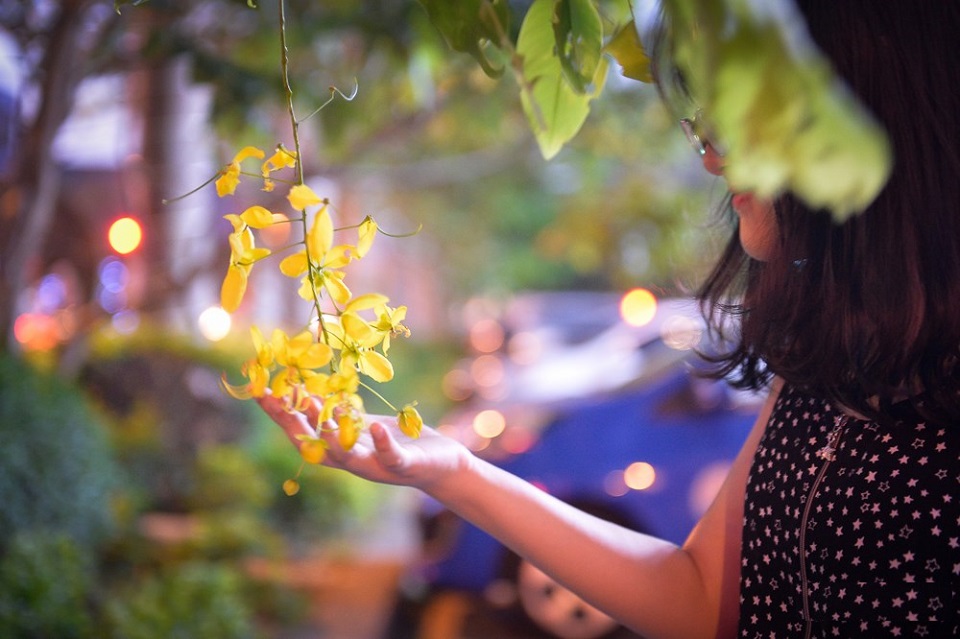 Những cánh hoa muồng đều mang một màu vàng tươi, 5 cánh đều như 5 cánh rất tròn trịa. Hoa thường sẽ nở thành từng cụm, sau đó mới rủ xuống hệt như mái tóc vàng óng ả của cô công chúa trong truyện cổ tích. Hoa ở cây này, cây kia cứ vậy mà thi nhau nở từng chùm lớn, những chiếc lá xanh bên cạnh như nép mình để nhường sự tỏa sáng cho sắc hoa muồng vàng. Hình ảnh hoa muồng cứ đẹp giản dị, như những kỷ niệm mà ai là người con xa quê luôn nhớ về.